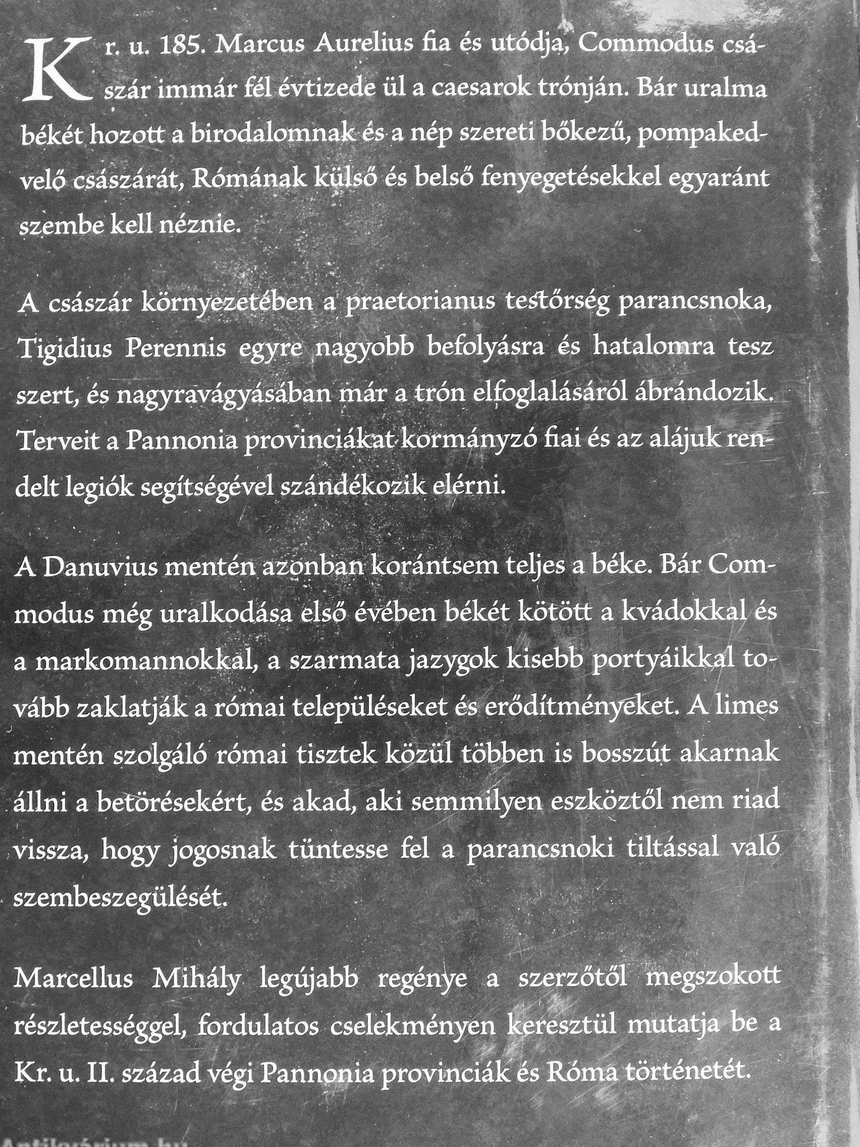 Kr. II. száznyolcvan. Marcus Aurelius császár halott. Fiát és örökösét, Commodust, mindeddig léha és kicsapongó i^únak ismerte meg a császári család és közvetlen környezete. Úgy tűnik azonban, a gyász és atyja szellemi öröksége mélyreható változást indított el a trónörökösben: nyilvánosan felvállalja Marcus Aurelius politikájának folytatását, és megfogadja, hogy egyetlen utolsó hadjárattal végleg térdre kényszeríti a Danuvius északi partján mozgolódó germán törzseket.