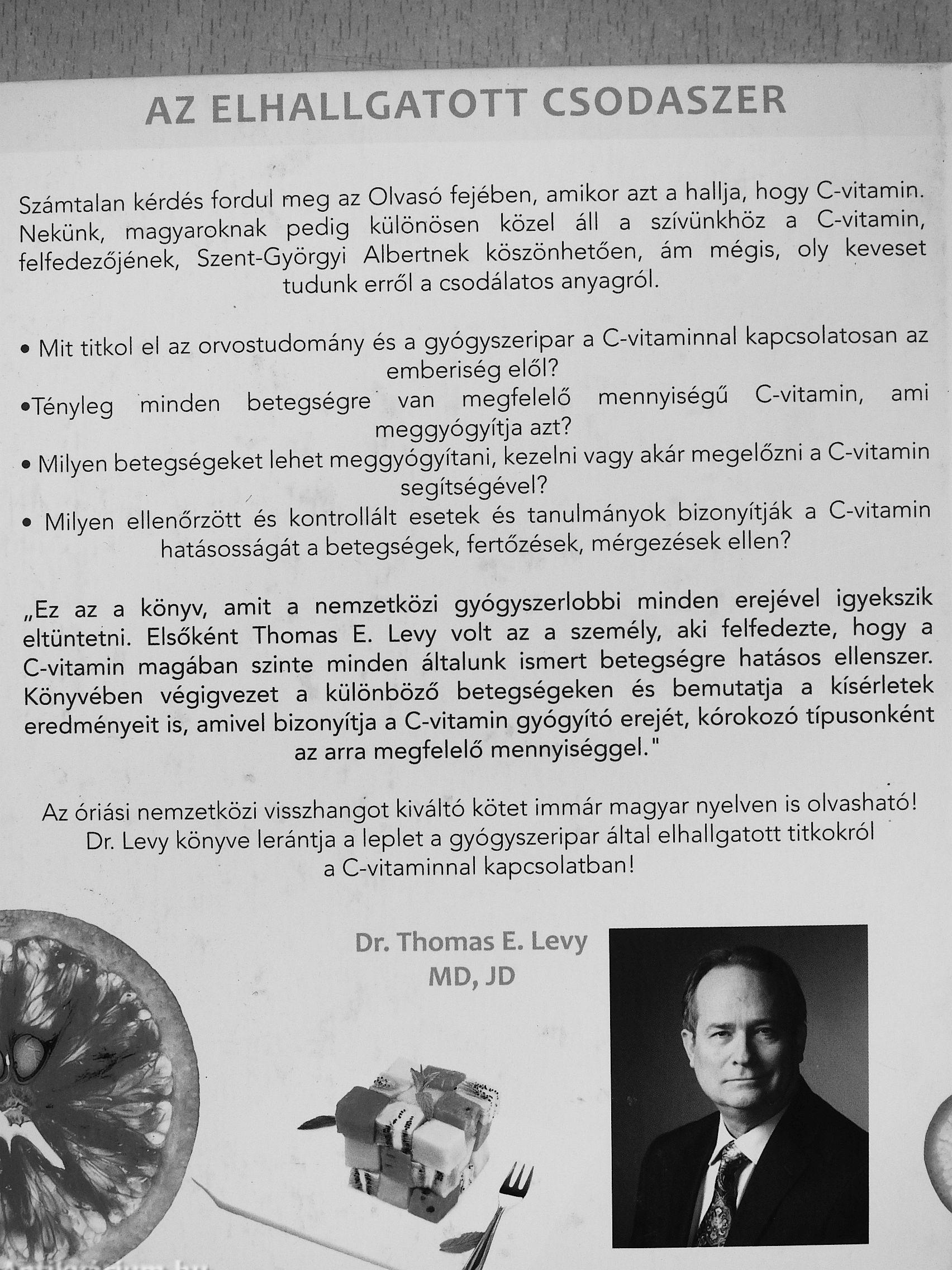 „Ez az a könyv, amit a nemzetközi gyógyszerlobbi minden erejével igyekszik eltüntetni. Elsőként Thomas E. Levy volt az a személy, aki felfedezte, hogy a C-vitamin magában szinte minden általunk ismert betegségre hatásos ellenszer. Könyvében végigvezet a különböző betegségeken és bemutatja a kísérletek eredményeit is, amivel bizonyítja a C-vitamin gyógyító erejét, kórokozó típusonként