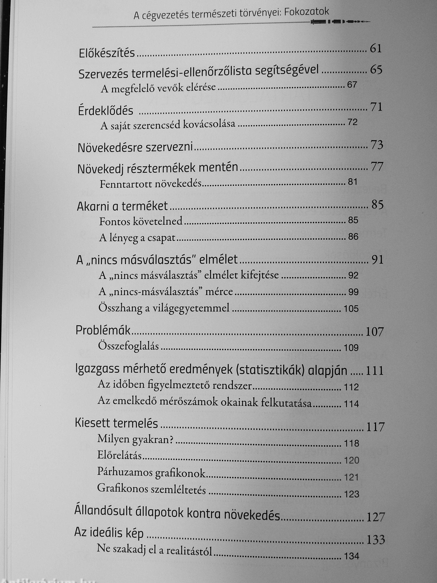 Személyes mércék: Meg fogod ismerni a viszonyítás szabályát, azaz Te hova teszed a mércéid? „A cég nem megy valami jól, de nem mentünk csődbe." „Nos, nem vagyok túl egészséges, de sokkal egészségesebb vagyok annál a hajléktalannál az árokban "Mihez viszonyítasz? A céljaid nem tudod elérni, ha a te szinted alatti dolgokhoz viszonyítasz! Ez a rész kristálytiszta betekintést enged abba, mennyi benned rejlő, kiaknázatlan lehetőséged van ahhoz képest, amit jelenleg elérsz. Tervezés: Ha a tervezésnél kudarcot vallasz, akkor a kudarcra tervezel. A tervezésről szóló rész könnyen megvalósítható terveket eredményez és az üzletben illetve az élet bármely területén nagyobb magabiztosságot eredményez. Irányelvek: A játékszabályok. Az irányelv a céged oxigénje, és gyakran a hiánya a családi és egyéb nehézségeid oka. Ez az éltető nedű. Vannak írott irányelveid? Betartják az emberek őket? Teljes egyetértés van az alkalmazottak, illetve családtagok közt az irányelvekről? Ha leírtad és kiadtad az irányelveidet, az sebességet jelent. És a sebesség a legjobb barátod. Ebben a bámulatos könyvben megismered miért.