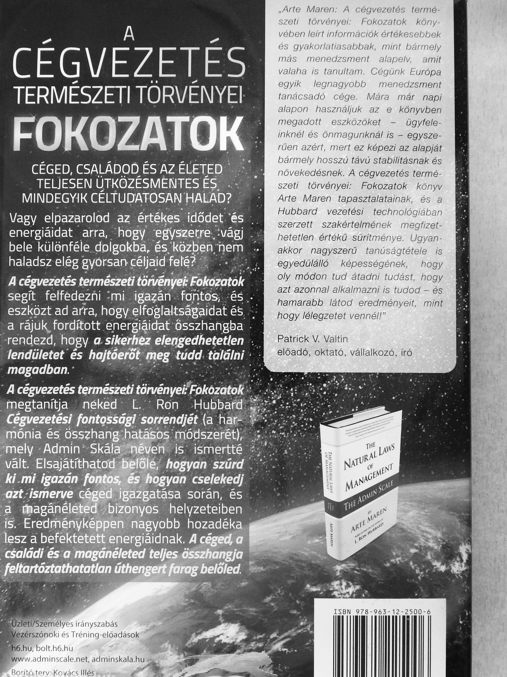 „Afte Marén: A cégvezetés természeti törvényei: FoÍ<ozato{< i<öny-vében leírt információk értékesebbek és gyakorlatiasabbak. mint bármely más menedzsment alapelv, amit valaha is tanultam. Cégünk Európa egyik legnagyobb menedzsment tanácsadó cége. Mára már napi alapon használjuk az e könyvben megadott eszközöket - ügyfeleinknél és önmagunknál is - egyszerűen azért, mert ez képezi az alapját bármely hosszú távú stabilitásnak és növekedésnek. A cégvezetés természeti törvényei: Fokozatok könyv Arte Marén tapasztalatainak, és a Hubbard vezetési technológiában szerzett szakértelmének megfizethetetlen értékű sűrítménye. Ugyanakkor nagyszerű tanúságtétele is egyedülálló képességének, hogy oly módon tud átadni tudást, hogy azt azonnal alkalmazni is tudod - és hamarabb látod eredményeit, mint hogy lélegzetet vennél!"