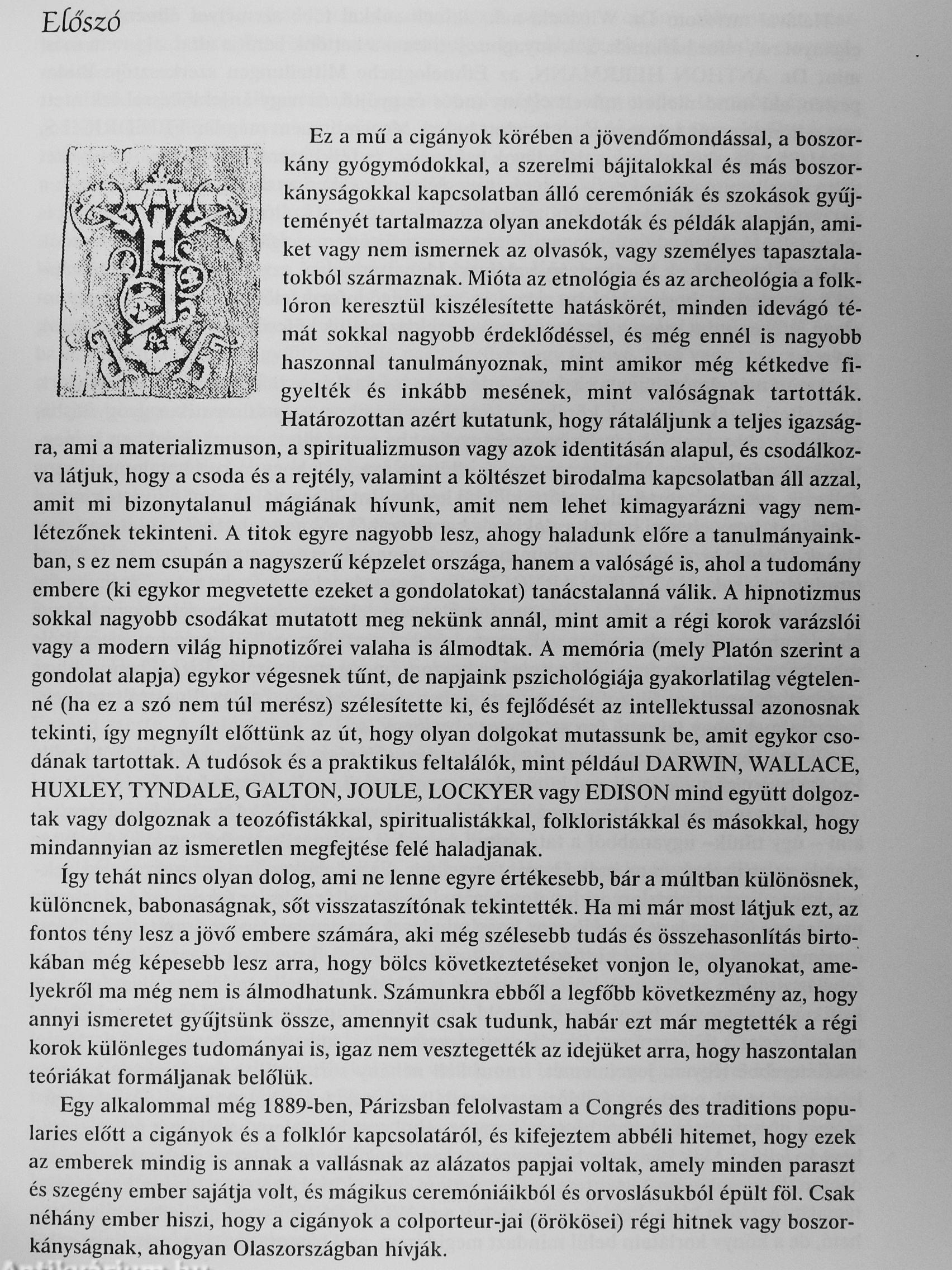Jelen mű a cigányok körében használt ceremóniák, és szokások gyűjteményét foglalja össze, melyek a jövendőmondással, a boszorkány gyógymódokkal, a szerelmi bájitalokkal és más boszorkányságokkal állnak kapcsolatban, olyan anekdoták és példák alapján, melyeket vagy nem ismernek igazán az olvasók, vagy személyes tapasztalatokból származnak. Ebben a néhány évben, mióta az Etnológia és az Archeológia hatalmas inspirációt kapott, és a folklóron keresztül kiszélesítette hatáskörét, minden egy olyan témához tartozik, melyet sokkal nagyobb érdeklődéssel, és még ennél is nagyobb haszonnal tanulmányoznak, mint akkor, mikor erőtlen, félig hívő, félig kételkedő szellemmel művelték, mely a valóságban inkább egy mese, mint indok volt. Határozottan azért kutatunk, hogy rátaláljunk a teljes igazságra, mely a materializmuson, a spiritualizmuson vagy azok identitásán alapszik, és csodálattal állunk azelőtt, hogy a csoda és a rejtély, valamint a költészet birodalma kapcsolatban áll azzal, amit mi bizonytalanul „mágiának" hívunk, melyet nem lehet kimagyarázni, vagy eltávolítani, és mely egyre nagyobb lesz, ahogy előre haladunk tanulmányainkban, mely nem csupán egy felhő ország, egy nagyszerű ország, hanem a valóság azon országa, ahol a tudomány embere, ki egykor csupán megvetette ezeket, a gondolatokat elhagyottá válik. A hipnotiz-mus sokkal nagyobb csodákat mutatott meg nekünk annál, mint amiket a régi korok varázslói, vagy a modern világ hipnotizálói valaha is megállapíthattak. A memóriát, mely Platón szerint a gondolat alapja, egykor egy meghatározott mennyiség volt, de mostanra ezt a mennyiséget napjaink pszichológiája gyakorlatilag a végtelenségre szélesítette ki (ha ez a szó nem túl merész), és tökéletes fejlődése az intellektussal azonos, és így nyíltan látjuk magunk előtt azt az erőt, hogy olyan dolgokat mutassunk be, melyeket egykor csodának tartottak. Nem kevésbé nyilvánvaló, hogy a tudósok és a praktikus feltalálók, mint például DARWIN, WALLACE, HUXLEY, TYNDALE, GAL-TON, JOULE, LOCKYER és EDISON mindannyian együtt dolgoztak, vagy dolgoznak a teozófusokkal, spiritualistákkal, a folkloristák-kal, és még sok más személlyel, nem külön-külön, hanem mindannyian az Ismeretlen megfejtése felé haladnak.