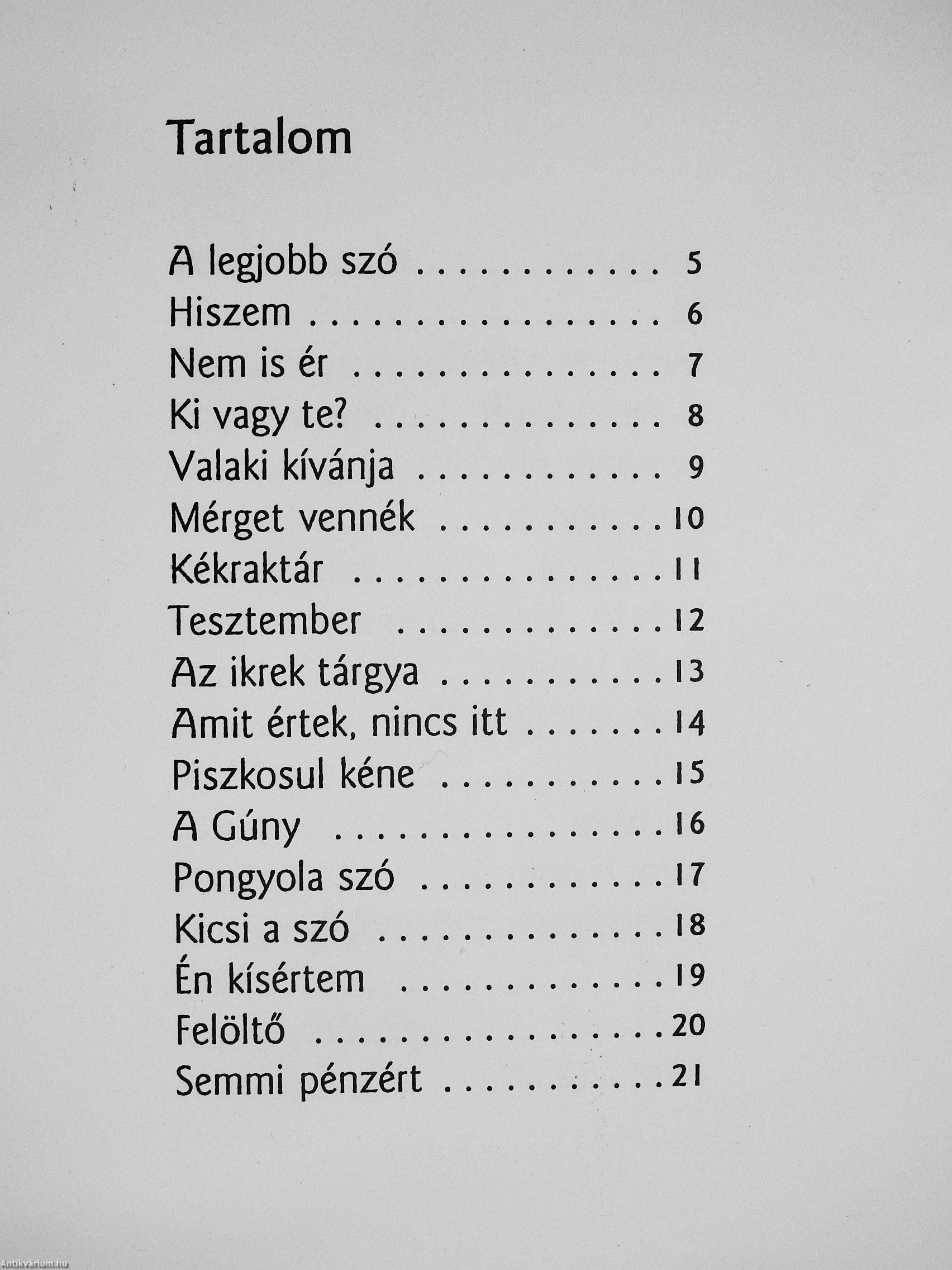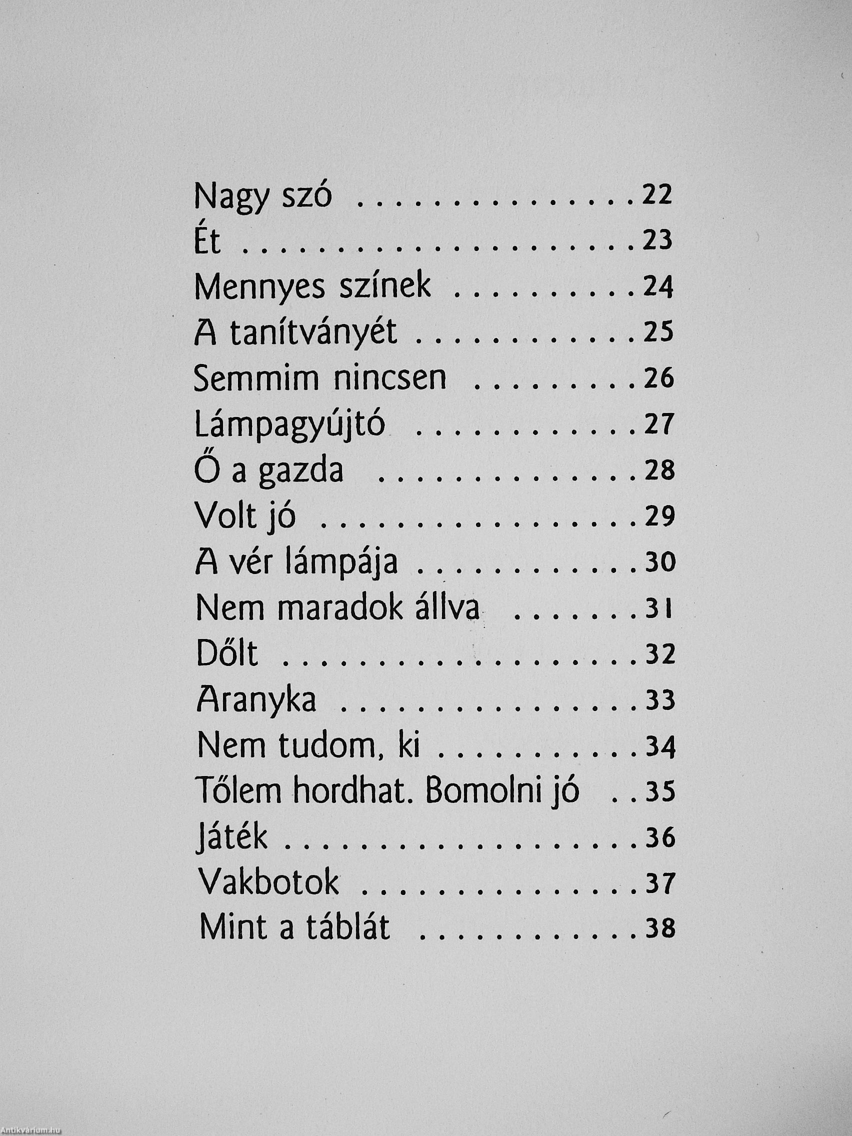 Van valamilyen térnövelő bűbáj ebben a könyvben. Nagyobb, mint amekkorának kívülről látod. Ha akarod, egy évig olvasgathatod, és minden hétre találsz benne egy olyan eredeti képet, amin egy hétig tűnődhetsz. De ha akarod, tíz perc alatt végigolvashatod, pedig benne van egy egész regény. Ha el akarod helyezni az irodalomtörténetben, azonnal megtelik idézettel és allúzióvd a fél világirodalomból Tolkientól Adyig. De ha mindez túl sok vagy túl kevés, akkor hidd el nekem, hogy fontos könyvet tartasz a kezedben: az utóbbi évtized egyik legsűrűbb, legpontosabb, legátgondoltabb verseskönyvét. Egy nagyerejű költő verseit, aki három kérdést tesz fel a lényegről: ki vagyok, honnan jövök, mi a dolgom.