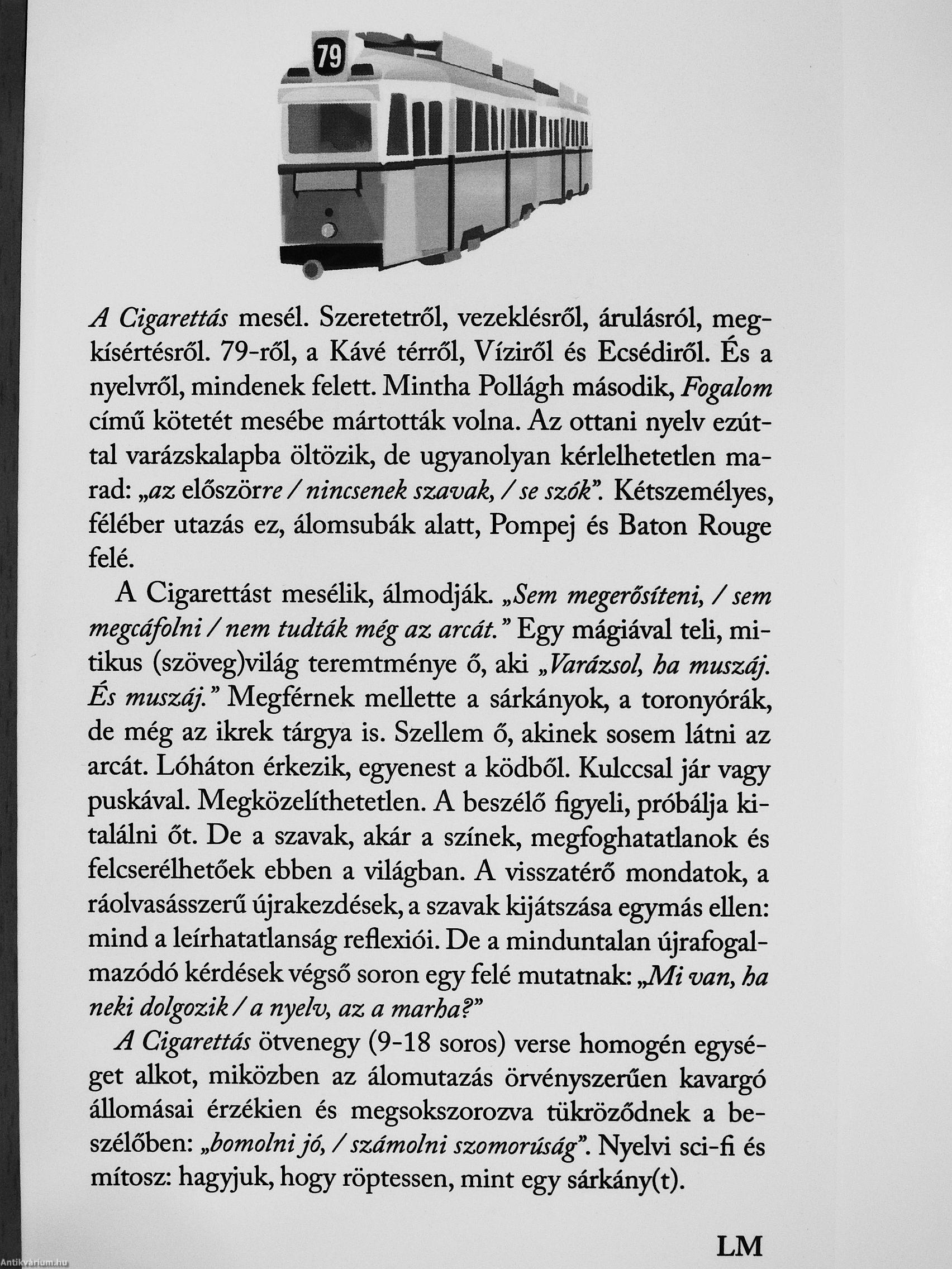 A Cigarettás mesél. Szeretetről, vezeklésről, árulásról, meg-kísértésről. 79-ről, a Kávé térről. Víziről és Ecsédiről. És a nyelvről, mindenek felett. Mintha PoUágh második. Fogalom című kötetét mesébe mártották volna. Az ottani nyelv ezúttal varázskalapba öltözik, de ugyanolyan kérlelhetetlen marad: „flz előszörre / nincsenek szavak, /se szók". Kétszemélyes, féléber utazás ez, álomsubák alatt, Pompej és Baton Rouge felé.