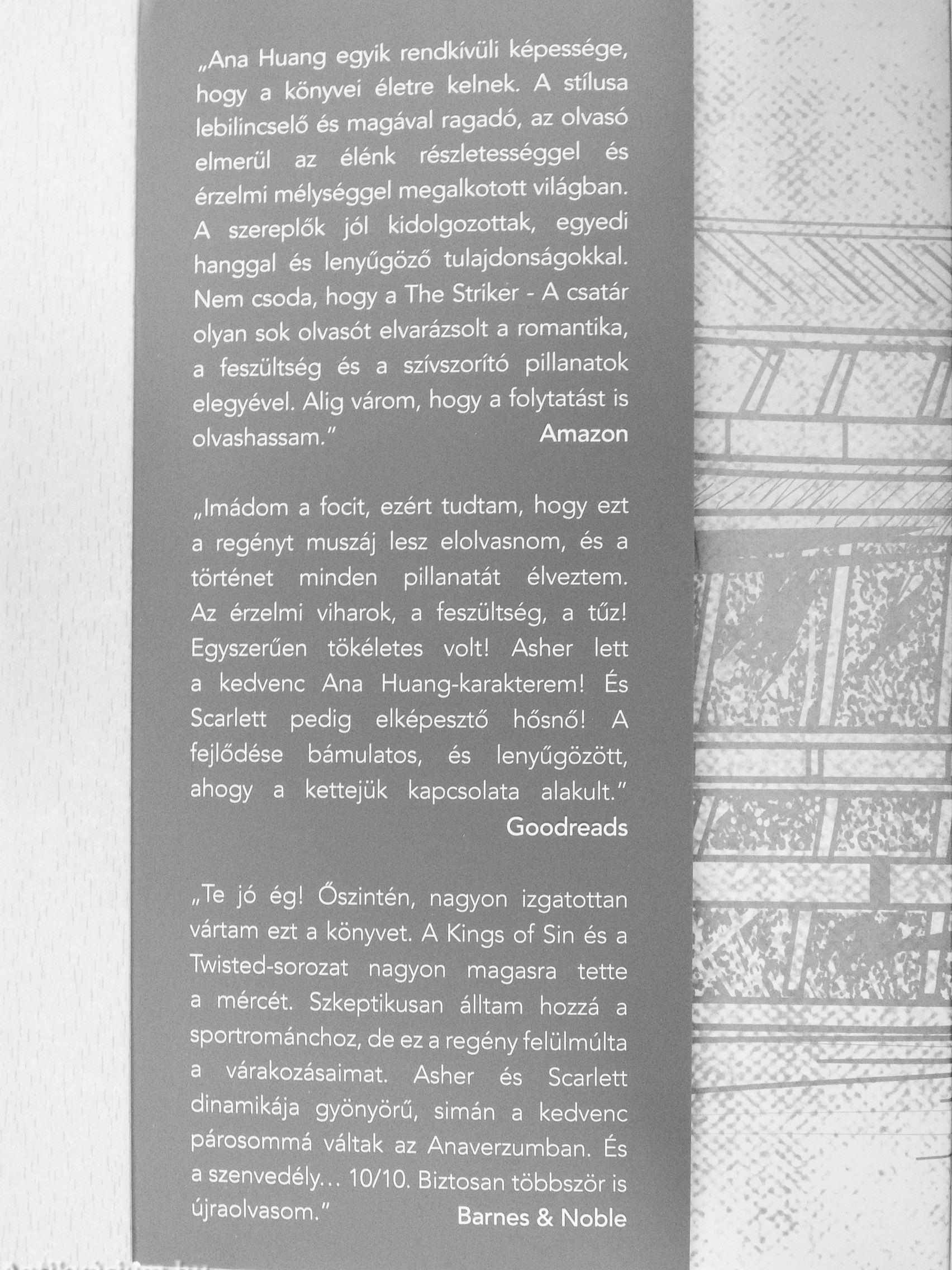 „Ana Huang egyik rendkívüli képessége, hogy a könyvei életre kelnek. A stílusa lebilincselő és magával ragadó, az olvasó elmerül az élénk részletességgel és érzelmi mélységgel megalkotott világban. A szereplők jól kidolgozottak, egyedi hanggal és lenyűgöző tulajdonságokkal. Nem csoda, hogy a The Striker - A csatár olyan sok olvasót elvarázsolt a romantika, a feszültség és a szívszorító pillanatok elegyével. Alig várom, hogy a folytatást is olvashassam." Amazon