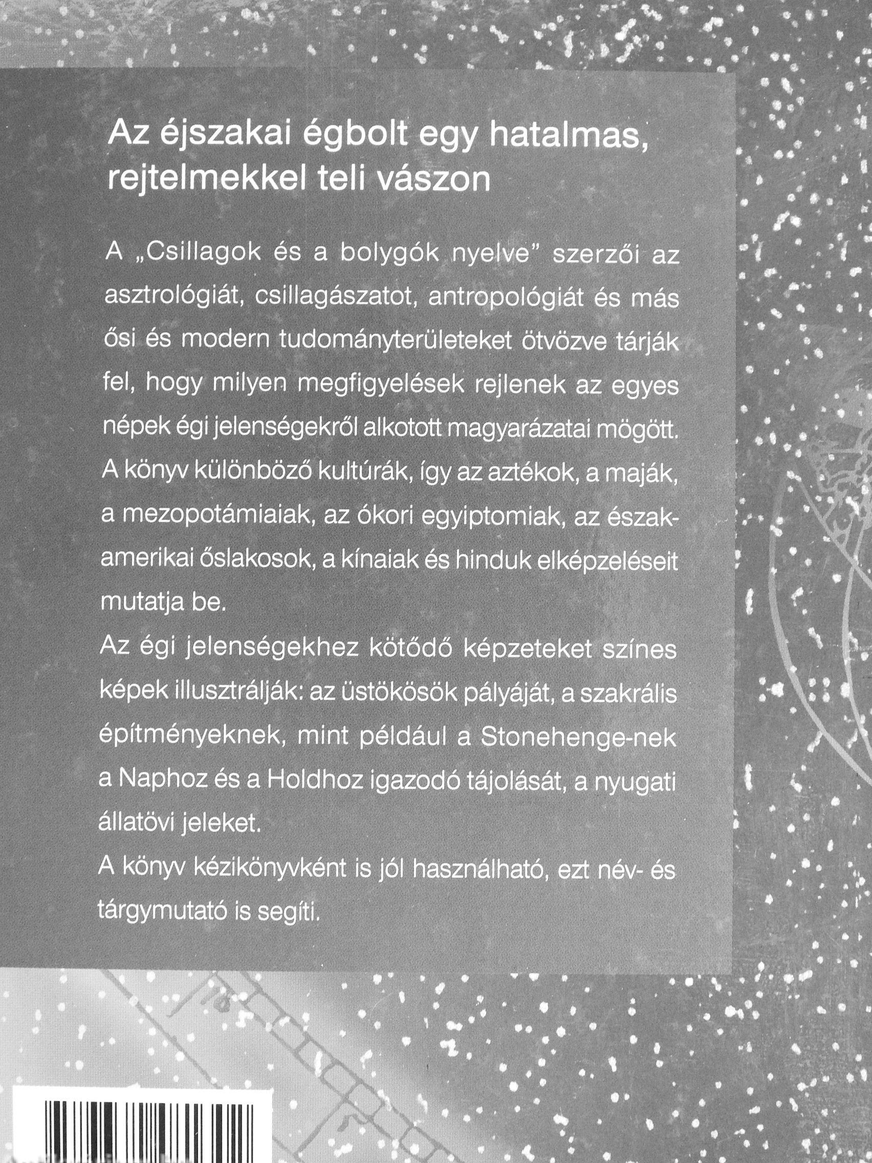 A „Csillagok és a bolygók,nyelve" szerzői az asztrológiát, csillagászatot, antropológiát és más ősi és modern tudományterületeket ötvözve tárják fel, hogy milyen megfigyelések rejlenek az egyes népek égi jelenségekről alkotott magyarázatai mögött. A könyv különböző kultúrák, így az aztékok, a maják, a mezopotámiaiak, az ókori egyiptomiak, az észak-- amerikai őslakosok, a kínaiak és hinduk elképzeléseit mutatja be.