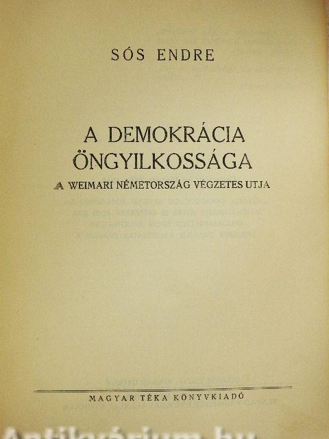 SÓS ENDRE a kitűnő író és publicista, „Az emberi jogok" és a „Három mártír" népszerű szerzője, A DEMOKRÁCIA ÖNGYILKOSSÁGA című új könyvében a publicista frisseségével és könnyedségével, de a történetíró felelősségérzetével és a társadalomtudós módszereivel írta meg A WEIMARI NÉMETORSZÁG VÉGZETES ÚTJÁ-t. Ez a marxista történetszemlélet alapján készült hatalmas tanulmány, amely minden regénynél érdekesebb, kézikönyve lehet a magyar demokráciának is. Ezért ajánlja a szerző a könyvet a magyar dolgozóknak, akiknek - saját érdekükből és az ország érdekében - meg kell gátolni, hogy köztársaságunk valaha is a weimari katasztrófa lejtőjére kerüljön.