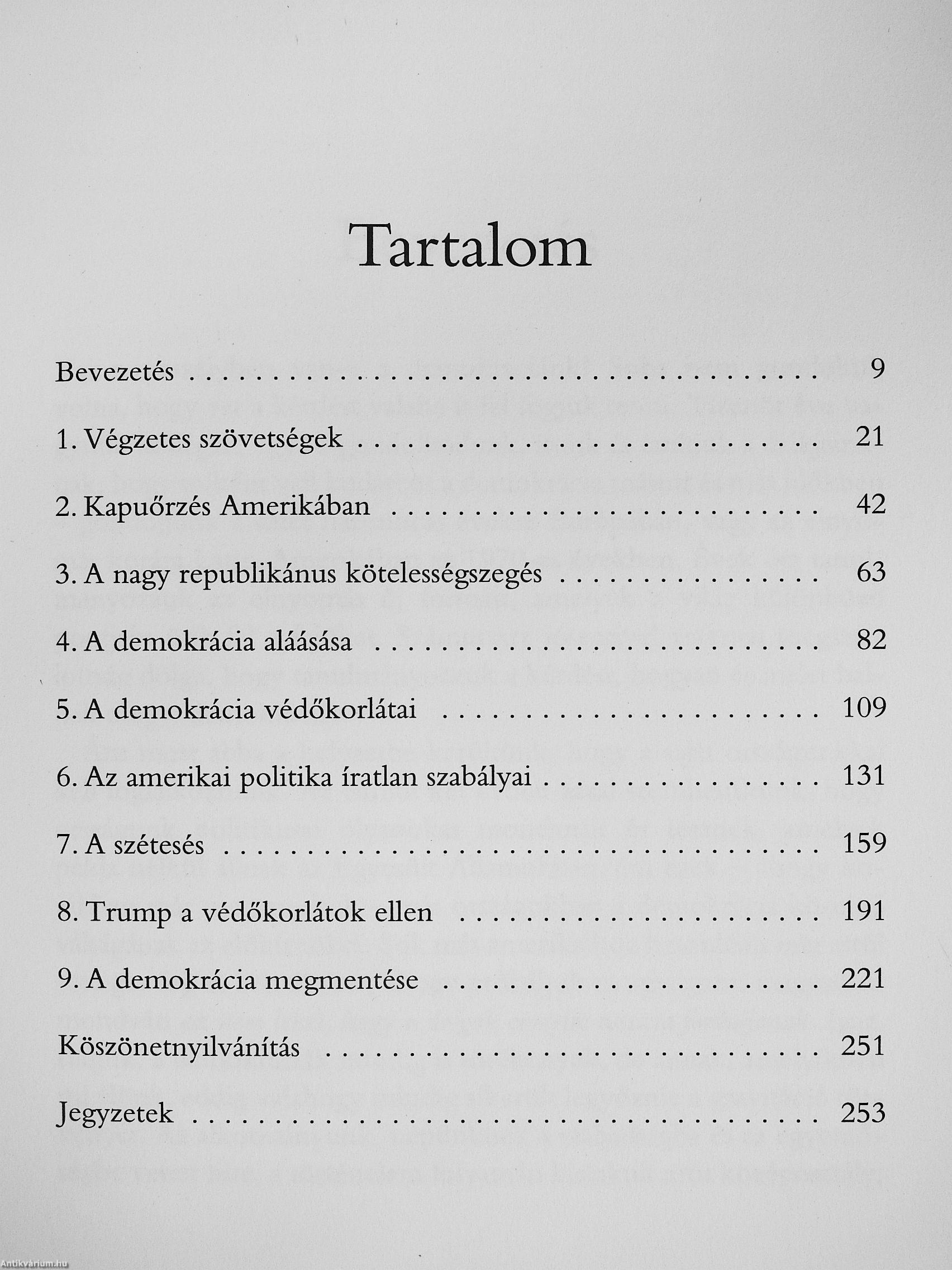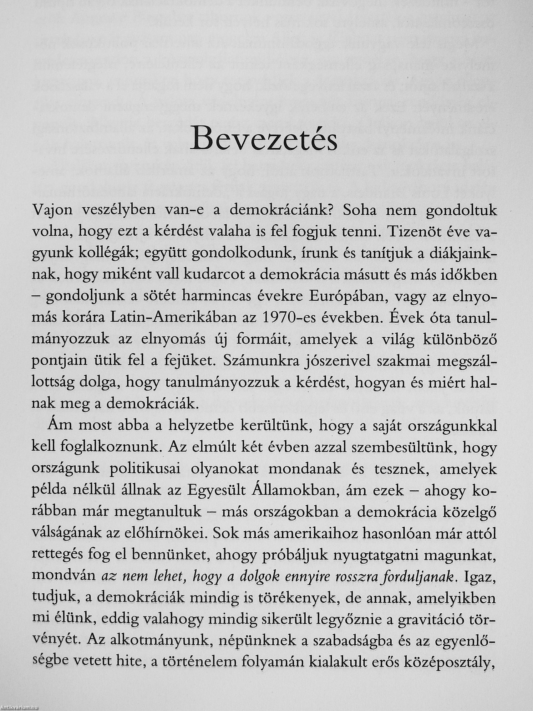 Két évvel ezelőtt egy ilyen könyv megírására nem kerülhetett volna sor: két politikaelmélettel foglalkozó ismert tudós, akiknek szakterülete a demokrácia összeomlása a világ más országaiban, felhasználja az ismereteit, hogy tájékoztassa az amerikaiakat azokról a veszélyekről, amelyek jelenleg az ő demokráciájukat fenyegetik. Hálásaknak kell lennünk ezeknek a szerzőknek, hogy alapos ismereteik segítségével megvilágítják a mai nap legfontosabb politikai kérdését.