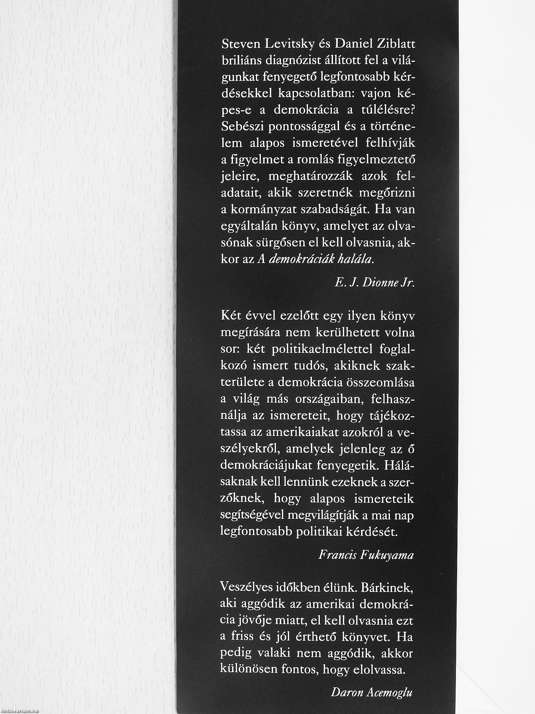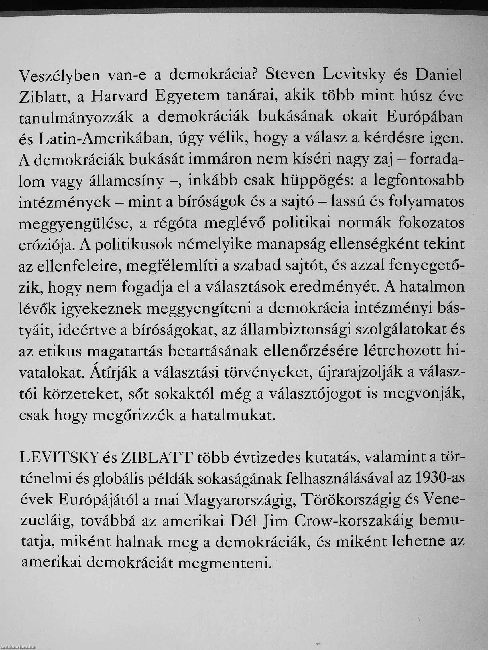 Veszélyben van-e a demokrácia? Steven Levitsky és Dániel Ziblatt, a Harvard Egyetem tanárai, akik több mint húsz éve tanulmányozzák a demokráciák bukásának okait Európában és Latin-Amerikában, úgy vélik, hogy a válasz a kérdésre igen. A demokráciák bukását immáron nem kíséri nagy zaj - forradalom vagy államcsíny -, inkább csak hüppögés: a legfontosabb intézmények - mint a bíróságok és a sajtó - lassú és folyamatos meggyengülése, a régóta meglévő politikai normák fokozatos eróziója. A politikusok némelyike manapság ellenségként tekint az ellenfeleire, megfélemlíti a szabad sajtót, és azzal fenyegetőzik, hogy nem fogadja el a választások eredményét. A hatalmon lévők igyekeznek meggyengíteni a demokrácia intézményi bástyáit, ideértve a bíróságokat, az állambiztonsági szolgálatokat és az etikus magatartás betartásának ellenőrzésére létrehozott hi-vatalokat. Átírják a választási törvényeket, újrarajzolják a választói körzeteket, sőt sokaktól még a választójogot is megvonják, csak hogy megőrizzék a hatalmukat.