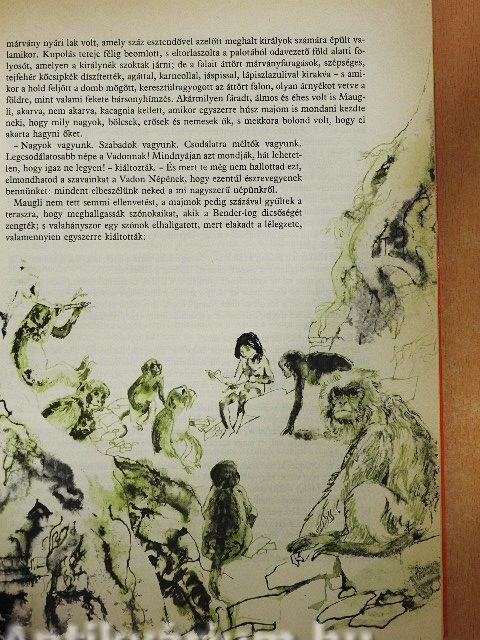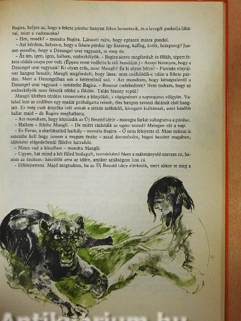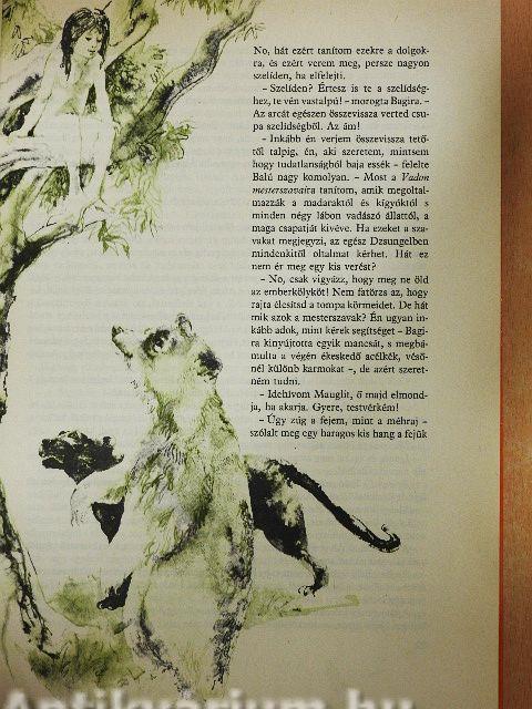 A bozótban megreccsennek a bokrok, és Farkas apó ugrásra készen, szinte a levegőben torpan meg, mert az orra előtt, egy alacsony ágba kapaszkodva meztelen kisgyerek áll. Soha ilyen pici, gödrös húsú embervakarcs nem került még éjnek idején farkas barlangjába. Maugli, a csupasz emberkölyök, bárhogy került is oda, ott marad, életét megváltotta a Szabad Nép Csapatának gyűlésén Bagira, a Fekete Párduc, egy frissen ejtett fiatal bikával és Balú, az öreg medve, a Vadon Törvényének mestere pedig jó szavával. Mauglit Farkas anyó neveli fel saját négy kölykével együtt, s az emberkölyök éppúgy érti a fű zizzenését, a baglyok huhogását, mint minden más élőlény a vadonban. Idővel oly merészen lódítja magát ágról ágra, hogy a szürke majmok sem különben. Elfoglalja helyét a Gyűlés Szikláján is, s ahogy nő, a falka testvérének tekinti s mindannyian a Dzsungel Urának. Akik Indiában jártak, és sokáig éltek a dzsungel közelében, mind azt állítják, hogy ez a táj semmi máshoz nem hasonlítható. Ott... Tovább