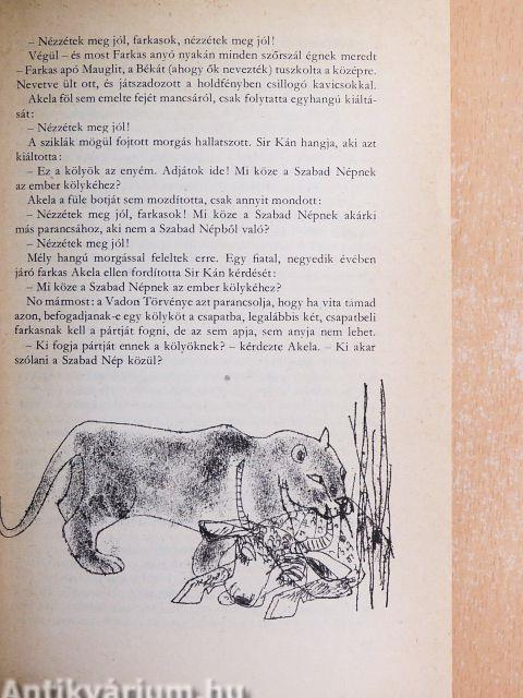 A bozótban megreccsennek a bokrok, és Farkas apó ugrásra készen, szinte a levegőben torpan meg, mert az orra előtt, egy alacsony ágba kapaszkodva meztelen kisgyerek áll. Soha ilyen pici, gödrös húsú embervakarcs nem került még éjnek idején farkas barlangjába. Maugli, a csupasz emberkölyök, bárhogy került is oda, ott marad, életét megváltotta a Szabad Nép Csapatának gyűlésén Bagira, a Fekete Párduc, egy frissen ejtett fiatal bikával és Balú, az öreg medve, a Vadon Törvényének mestere pedig jó szavával. Mauglit Farkas anyó neveli fel saját négy kölykével együtt, s az emberkölyök éppúgy érti a fű zizzenését, a baglyok huhogását, mint minden más élőlény a vadonban. Idővel oly merészen lódítja magát ágról ágra, hogy a szürke majmok sem különben. Elfoglalja helyét a Gyűlés Szikláján is, s ahogy nő, a falka testvérének tekinti s mindannyian a Dzsungel Urának. Akik Indiában jártak, és sokáig éltek a dzsungel közelében, mind azt állítják, hogy ez a táj semmi máshoz nem hasonlítható. Ott pirosabb a piros, zöldebb a zöld, a vizek és az ég csillogása kékebb és ezüstösebb, s aki egyszer ott élt, a vadállatokra is szeretettel gondol vissza. Rudyard Kipling is Indiában látta meg a napvilágot, ahol apja - angol szobrász és festő - azért telepedett meg, hogy felkutassa India művészetét, az őserdő mélyén rejtőző csodákat. Rudyard Kipling is apja nyomán járt, és bár beutazta a világot, és hírneves író, költő lett, soha semmi nem férkőzött olyan közel szívéhez, mint a dzsungel, és soha semmit nem írt meg olyan szépen, mint a Vadon Népének életét. Benedek Marcell ihletett tolmácsolása, Weöres Sándor gyönyörű versfordításai, Szántó Piroska rajzai festőien tárják az olvasó elé ennek a semmihez sem hasonlítható világnak tájait és alakjait.