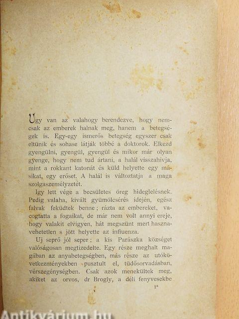 Uj seprő jól seper; a kis Parászka községet valóságosan megtizedelte. Egy része meghalt magában az anyabetegségben, más része az utókövetkezményekben pusztult el, tüdősorvadásban, vérszegénységben. Csak azok menekültek meg, akiket az orvos, dr. Brogly, a déli fenyvesekbe küldött, ahol fölvették magukat, húst és vért szedtek össze...