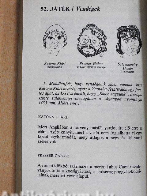 E karikatúrák igyekeznek kárpótolni azért a veszteségért, melyet a műsor vendégeinek, személyes jelenlétüknek a hiánya okoz. Nem vitás, a vetélkedő sikerében az oroszlánrész az övék volt. És ezért ezúton is hálámat, köszönetemet fejezem ki nekik. Egyéni előadásmódjuk, csak rájuk jellemző gesztusaik nagyon hiányoznak az írott anyagból. De a rajzok, a válaszok talán mégis segítenek felidézni a karakterükből valamit.