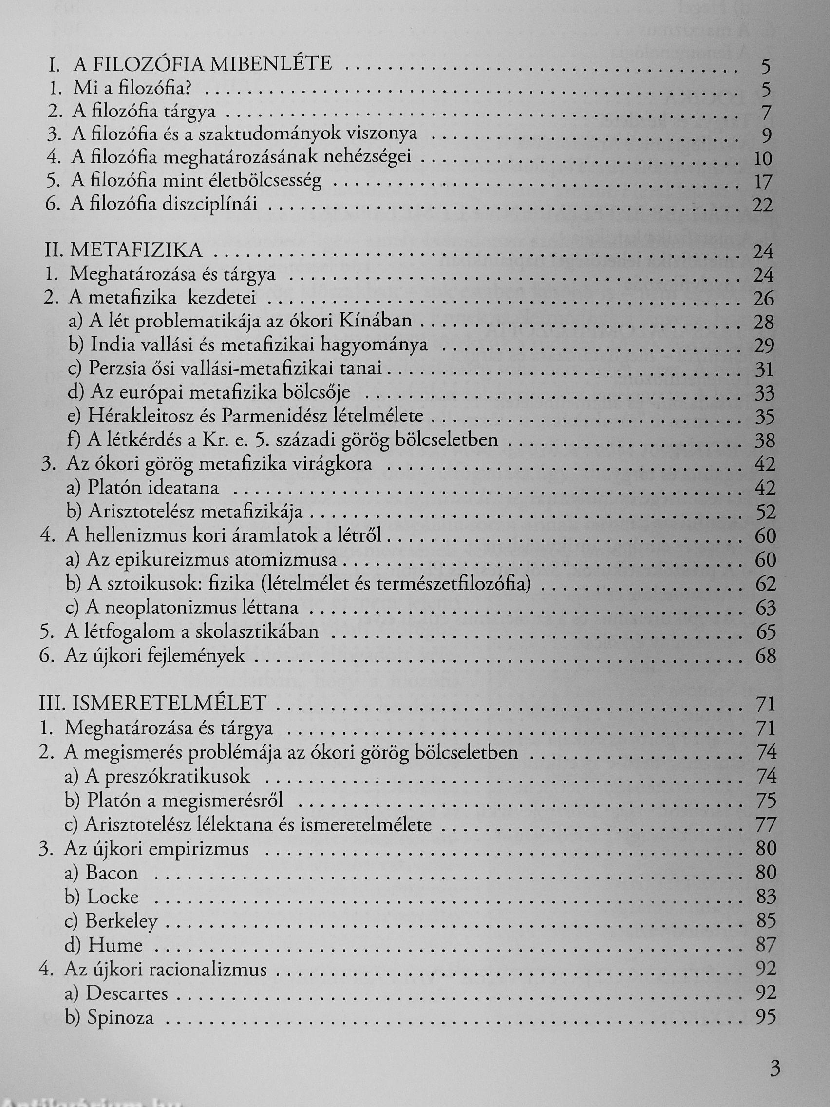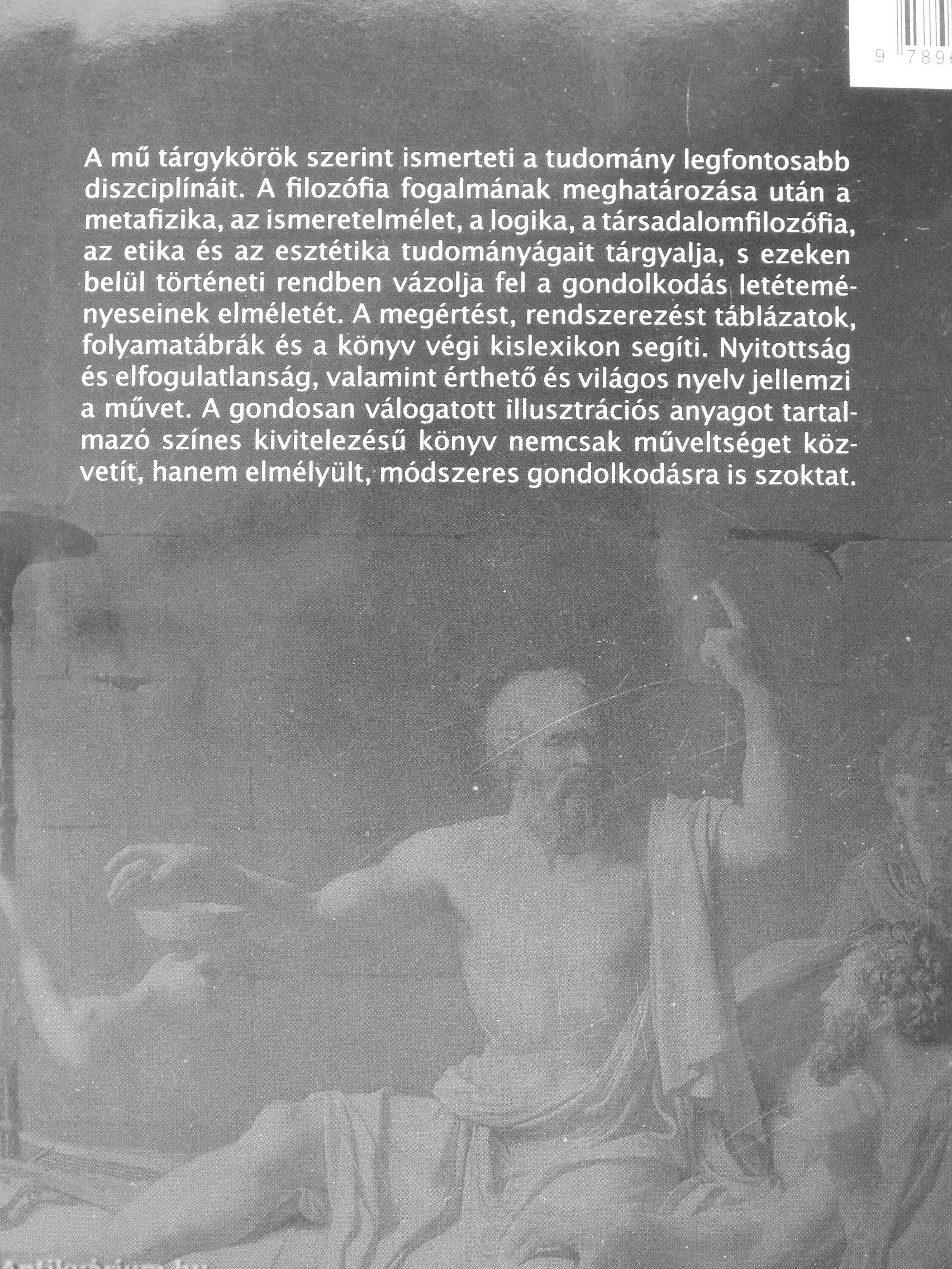 A mű tárgykörök szerint Ismerteti a tudomány legfontosabb diszciplínáit. A filozófia fogalmának meghatározása után á metafizika, az Ismeretelmélet, a .logika, a társadalomfilozófia, az etika és az esztétika tudományágalt tárgyalja, s ezeken belül történeti rendben vázolja fel a gondolkodás letéteményeseinek elméletét. A megértést, rendszerezést táblázatok, folyamatábrák és a könyv végi kislexikon segíti. Nyitottság és elfogulatlanság, valamint érthető és világos nyelv jellemzi a művet. A gondosan válogatott Illusztrációs anyagot tartalmazó színes kivitelezésű könyv nemcsak műveltséget közvetít, hanem elmélyült, módszeres gondolkodásra is szoktat.