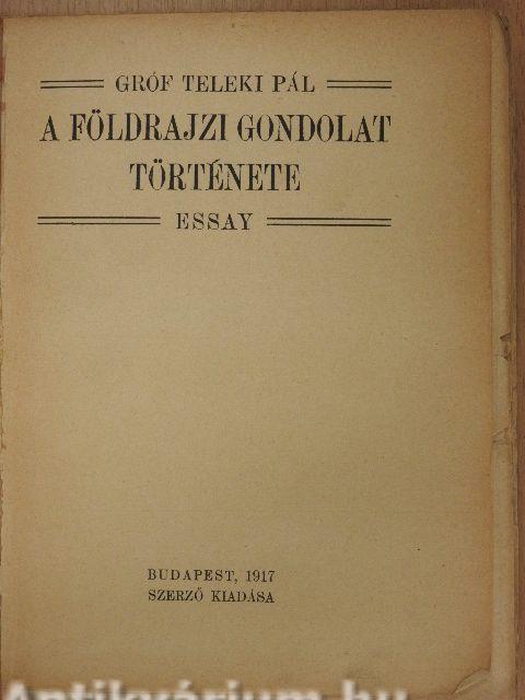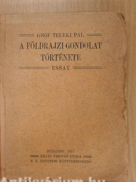 A földrajzi gondolat története nem a földrajzi tudomány, mint tudományszak története, mert földrajzi gondolat alatt a rajtunk kívül levő, a velünk szembenálló világnak, környezetünknek mindenkori felfogását értem. És ez a gondolat, mint az öntudatára ébredt embernek kapcsolata lakóhelyével, a földdel, nem egy tudományé, hanem általános emberi. Ezért a földrajzi gondolat története nem lehet egy tudományszaknak, nem is egyetlen fogalomkörnek problémája.