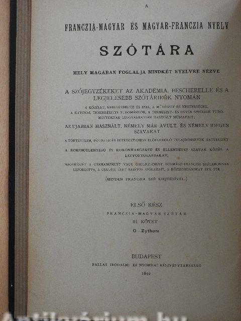 O-Zythum/Dictionnaire Francais-Hongrois et Hongrois-Francais - I.: Franczia-magyar szótár/Dictionnaire Francais-Hongrois vol. I./Mely magában foglalja mindkét nyelvre nézve a szójegyzékeket az Akadémia, Rescherelle és a legjelesebb szótárirók nyomán