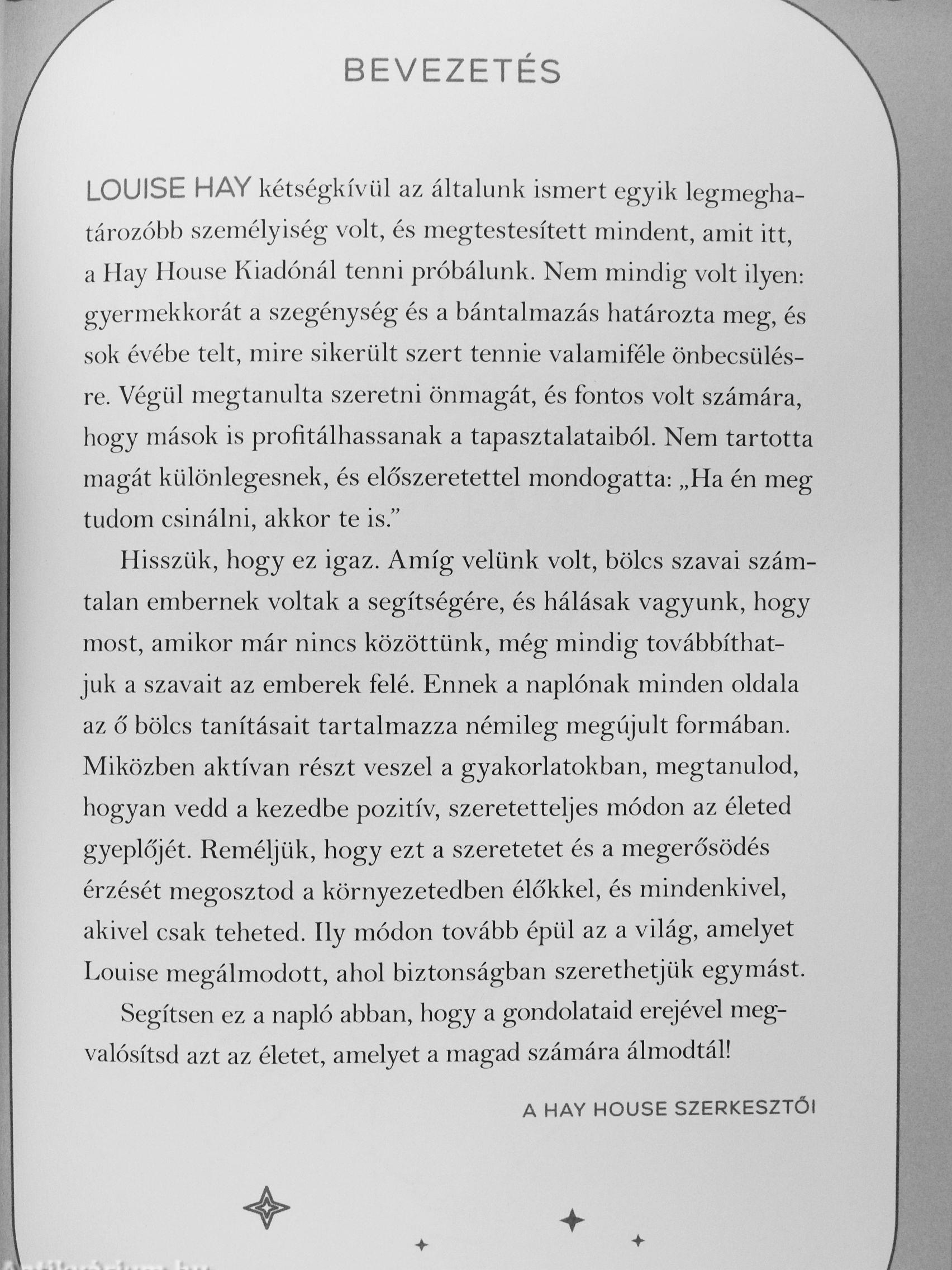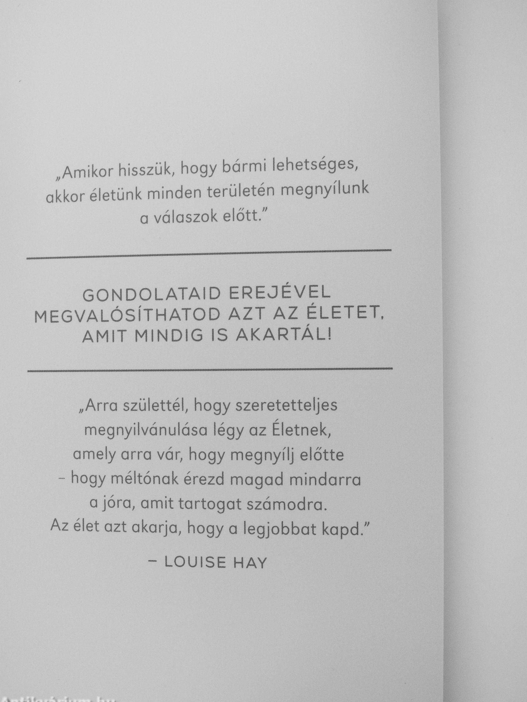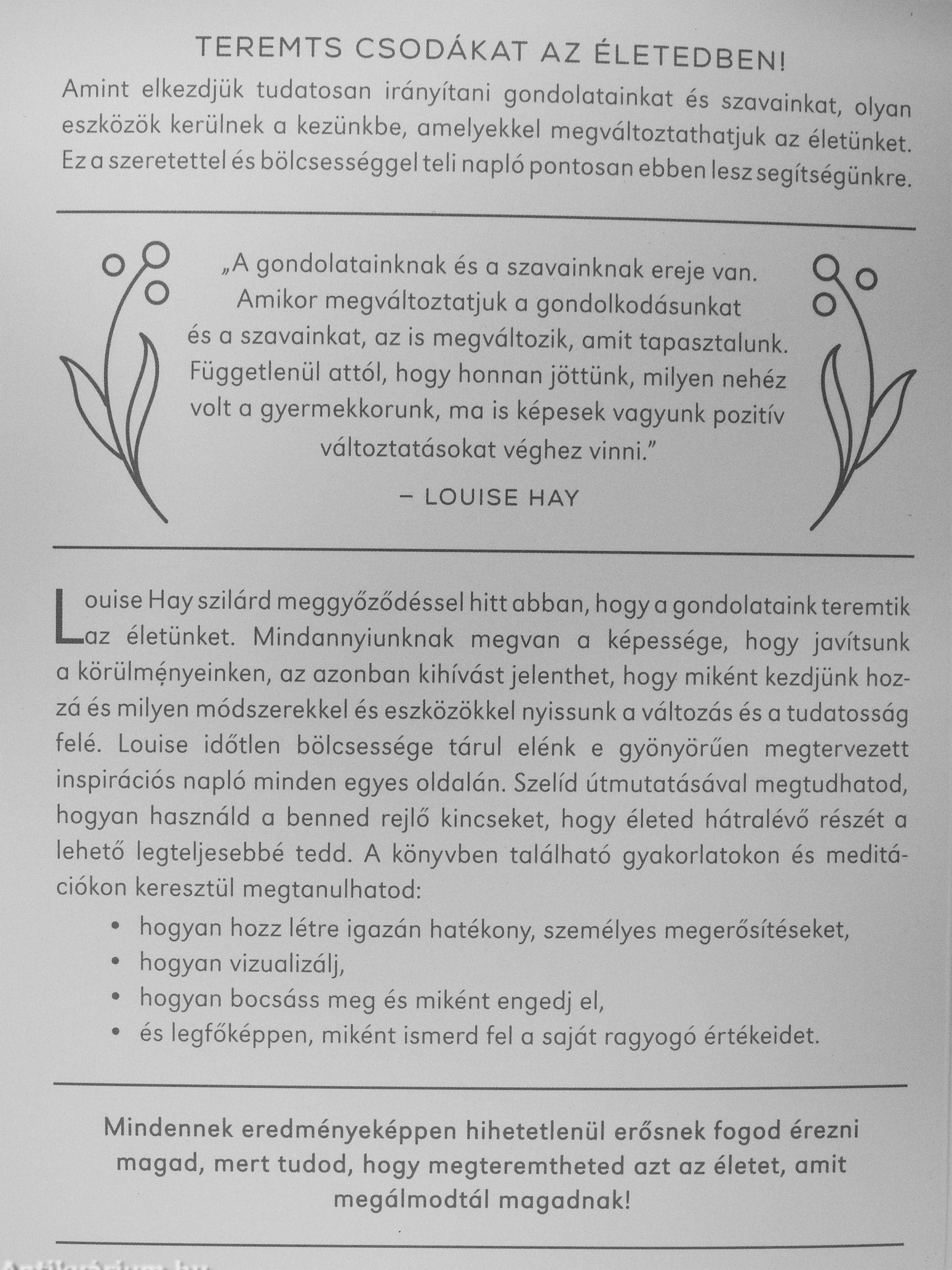 Louise Hay szilárd meggyőződéssel hittabban, hogya gondolatainkteremtik az életünket. Mindannyiunknak megvan a képessége, hogy javítsunk a körülményeinken, az azonban kihívást jelenthet, hogy miként kezdjünk hozzá és milyen módszerekkel és eszközökkel nyissunk a változás és a tudatosság felé. Louise időtlen bölcsessége tárul elénk e gyönyörűen megtervezett inspirációs napló minden egyes oldalán. Szelíd útmutatásával megtudhatod, hogyan használd a benned rejlő kincseket, hogy életed hátralévő részét a lehető legteljesebbé tedd. A könyvben található gyakorlatokon és meditációkon keresztül megtanulhatod: