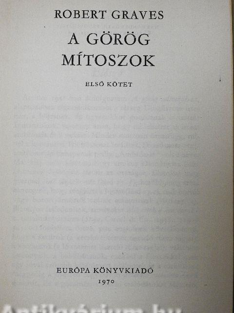 Robert Graves, a kitűnő angol költő és népszerű regényíró több évtizedes kutatómunkájának összefoglalása ez a kétkötetes mű. Az olvasó megtalálhatja benne az összes görög mítoszokat - a teremtésmítoszokat, az Olümposz sokszor nagyon is emberi isteneinek és istennőinek születését és viselt dolgait, a nagy hősök, Thészeusz, Héraklész csodás kalandjait, Oidipúsz szomorú sorsát, Oresztész bosszúját, az aranygyapjú történetét, a trójai háborút, a csavaros eszű Odüsszeusz bolyongását -, világos, élvezetes modern prózába öntve. A mű bőséges irodalmat ajánl a tovább érdeklődőknek, és közli a tudomány, elsősorban a régészet és antropológia magyarázatát is az egyes mítoszok eredetére és értelmezésére.
