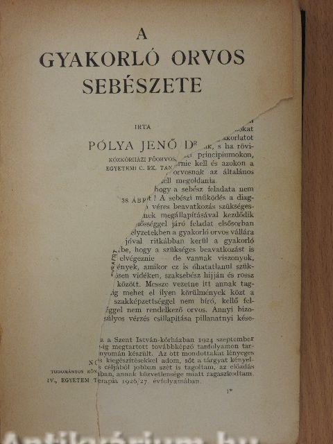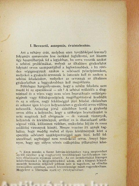 Azt a néhány órát, melyben ezen továbbképző kurzus folyamán szerencsém lesz önökkel foglalkozni, azt hiszem úgy használhatjuk fel a legjobban, ha sorra vesszük azokat a sebészi problémákat, melyek az általános gyakorlatot folytató orvos szempontjából a legfontosabbak, s ha röviden végigmegyünk azokon a sebészeti principiumokon, melyeket a gyakorló orvosnak is ismernie kell és azokon a sebészi feladatokon, melyeket az orvosnak az általános gyakorlatban a leggyakrabban kell megoldania.