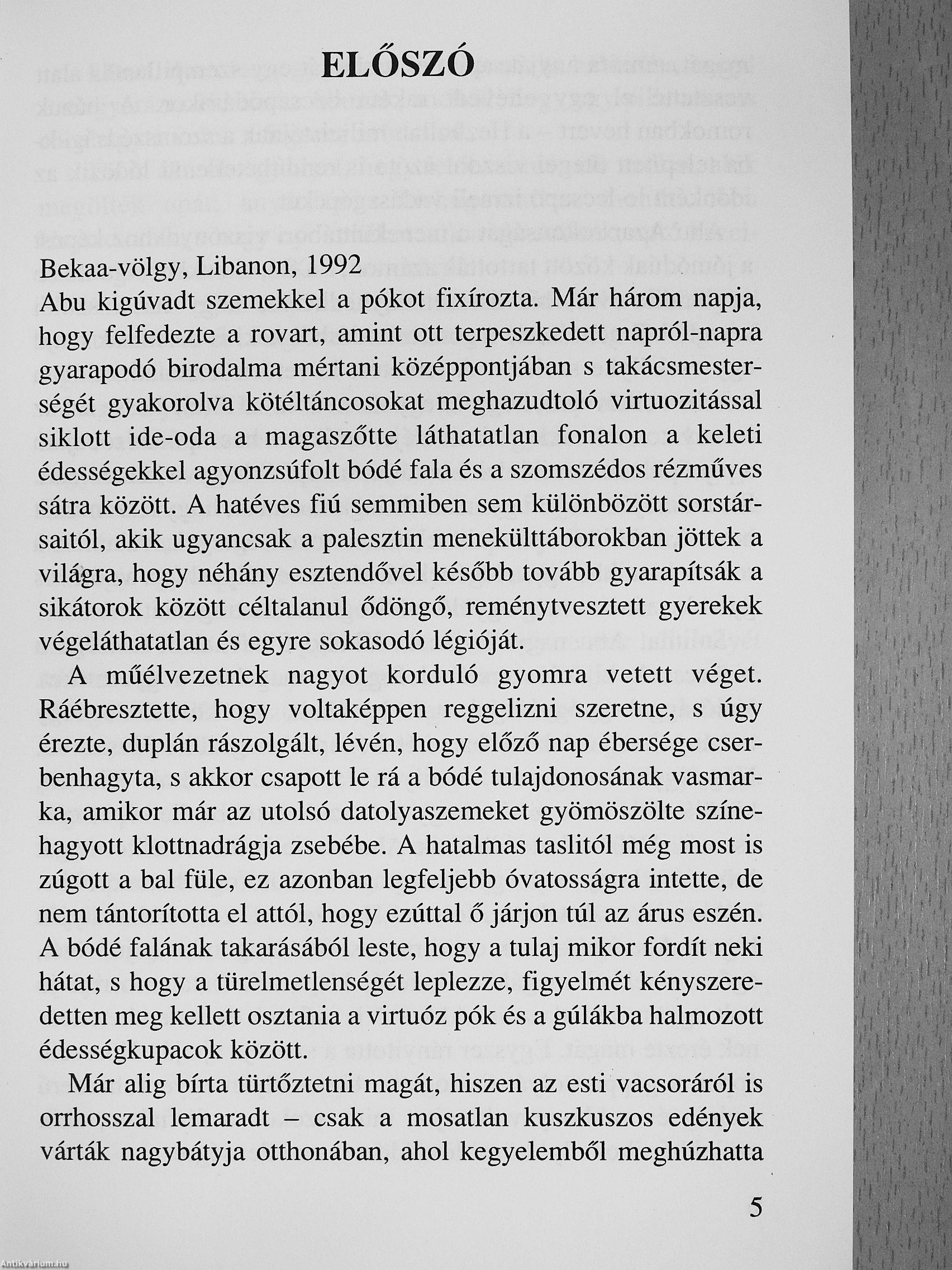 ¦ Harákolásra emlékeztető arab szavak egymásutánja váltotta fel Terim angolját. Izgatottak voltak és fenyegetők, sürgetők és parancsolok. Szabolcs moccanni sem bírt, olyan görcsösen szorította fülére a parányi készüléket, hogy ujjpercei belefehéredtek, s furcsán csillogtak, amint hajlatukból kövér verítékcseppek törtek utat csuklója irányába. Az élénk, pergő ritmusú szavak vegyültek a mély, vészjóslókkal. Majd a korhadó pallók reccsenéseit másodpercekre megtörte a kegyetlen csend. Idegőrlő prepozíció a hátborzongató végjáték előtt. Pillanatokkal később Terim szaggatott, ziháló hangja rándította görcsbe a gyomrát. Szabolcs annak ellenére, hogy egy kukkot sem értett az arab nyelven sugárzott drámából, Al-Jazeera-s kollégájának hangjából inkább a megvetés, semmint az életéért való könyörgés érződött.