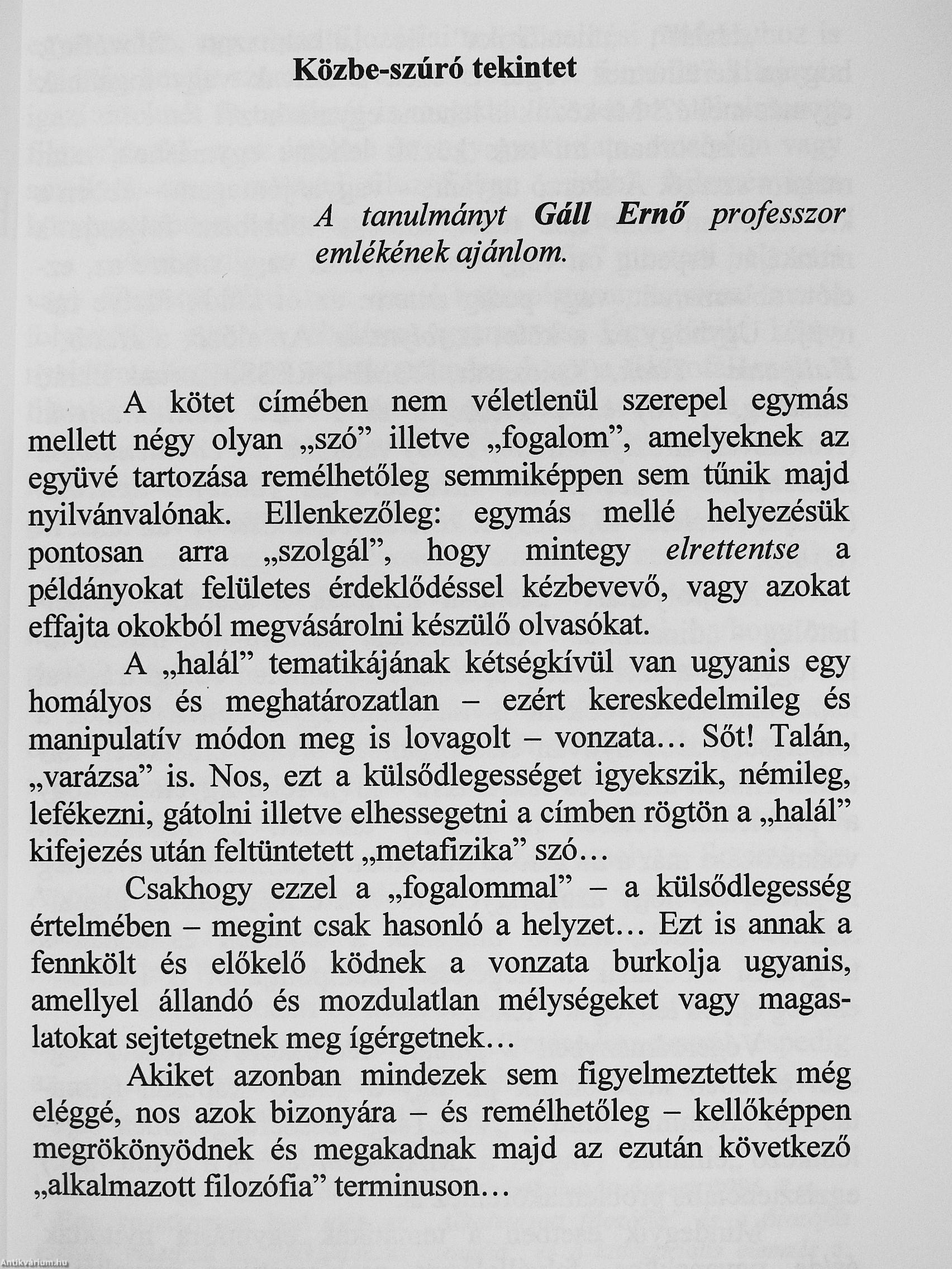 A tény, hogy az európai kultúra és civilizáció két olyan országában mínti Hollandia és Belgium, nemrég jogilag is lehetővé tették illetve szabályozták az^ euthanáziát - azaz: a "kegyes halált" - olyan alapvető' változásokat jeleiit, amelyek elképzelhetetlenek ugyancsak alapvető egzisztenciális módosulások nélkül. Mégis: a halál ma is a hallgatás, a személytelen kórházi osztályok gépezetei, valamint a nyilvános ellátások és a szolgáltatások régióinak a - sojí- i ban "technidzált" - televény,^ és ebben, valamint ekképpen, problemá-tizálják is azt, mondjuk a tudó^^agy a tudományos (elemző^ tanulmányokban is. ¦ • Ennek ellenére, a halál, nyilván, továbbra is megmarad "megoldhatatlaif" !j problémának lenni, vagyis olyannak, amelynek nincs és nem is lehetséges egl'-fajta, őt felszámoló vagy kiküszöbölő, vagy/valamint instrumentalizálh^ó "megoldása" sem. Azaz: a halál metafizikai faktum volt, és az is marad mind-., addig ameddig élő ember egyáltalán megszületik!!! Az alkalmazott tl|ozóflai-' lag lerögzített és csökönyösen kitartott kérdés mármost az, hogy mit is tett, 1-letve tesz vagy" kezdhet ezzel, egyrészt, a "metafizika", másrészt pedigía | "thanatológia" (és az egyéb "foglalatosságok") valamint - de azért a dolog ! leglényegében - maga a gondolkodó, és/azaz a halandó ember is? Itt nyílvád - ^ és főlcént alkalmazott filozóflailslg - mindenek előtt arról lehet szó, bogy bebiztosítsuk a halál sajátos faktuna-mivoltával való szembesülés elméleti és zisztenciális kereteit és eszközeit^ mégpedig úgy, hogy eközben a halál temaW- i káját kiszabadítsuk annak az "eldugásának" a hag>'ományadta - de aktuális i - televényéből is. ? f í .