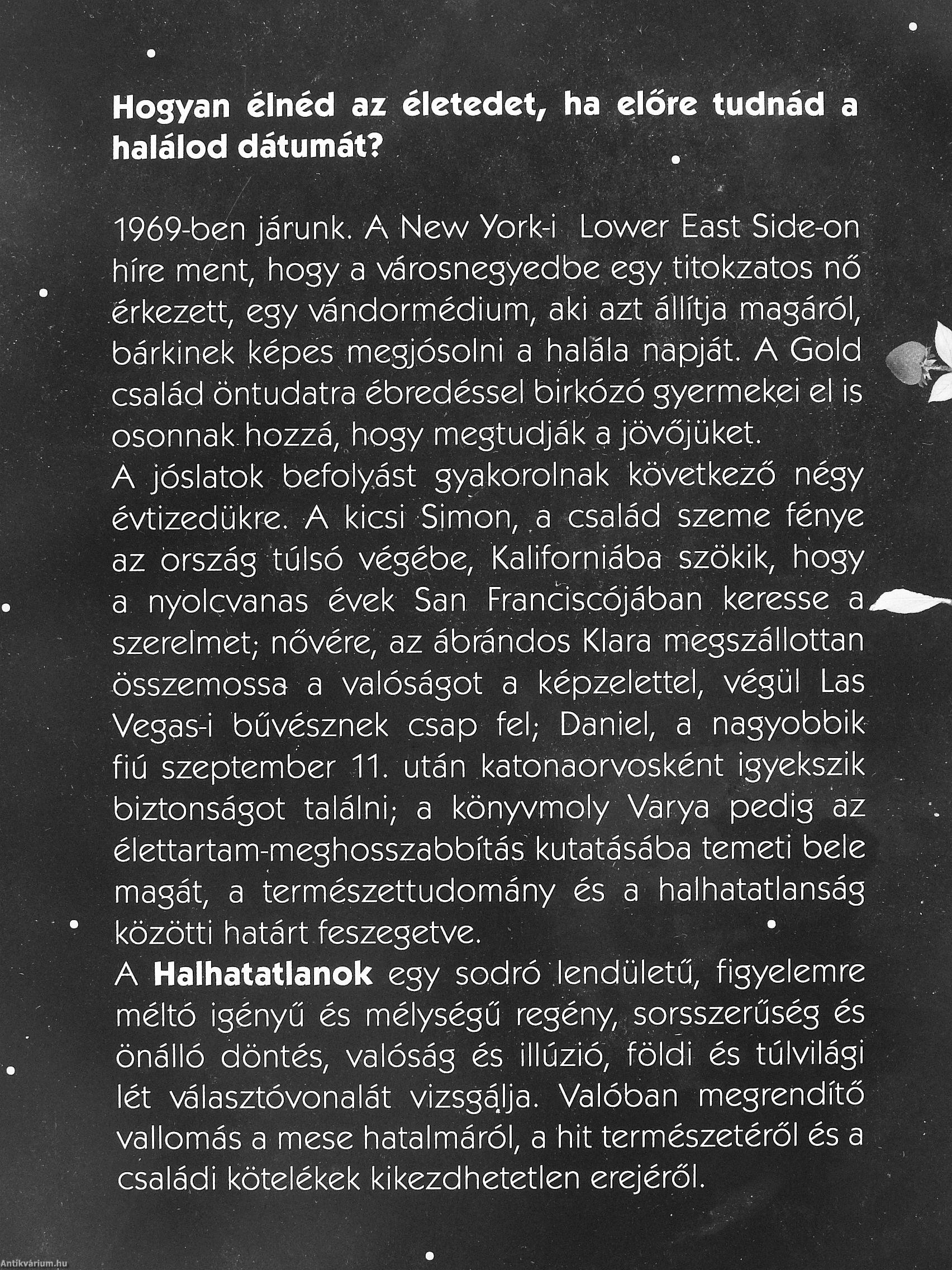 19ó9-ben járunk. A New York-i Lower East Sid€-on híre ment, hosy a városnesyedbe egy titokzatos nő érkezett, egy vándormédium, aki azt állítja magáról, bárkinek képes megjósolni a halála napját. A Gold család öntudatra ébredéssel birkózó gyermekei el is osonnak, hozzá, hogy megtudják a jövőjüket. A jóslatok befolyást gyakorolnak következő négy évtizedükre. A kicsi Simon, a család szeme fénye az ország túlsó végébe, Kaliforniába szökik, hogy a nyolcvanas évek San Franciscójában keresse a. szerelmet; nővére, az ábrándos Klara megszállottan összemossa a valóságot a képzelettel, végül Las Vegas-i bűvésznek csap fel; Dániel, a nagyobbik fiú szeptember 11. után katonaorvosként igyekszik biztonságot találni; a könyvmoly Varya pedig az élettartam-meghosszabbítás kutatásába temeti bele magát, a természettudomány és a halhatatlanság közötti határt feszegetve.