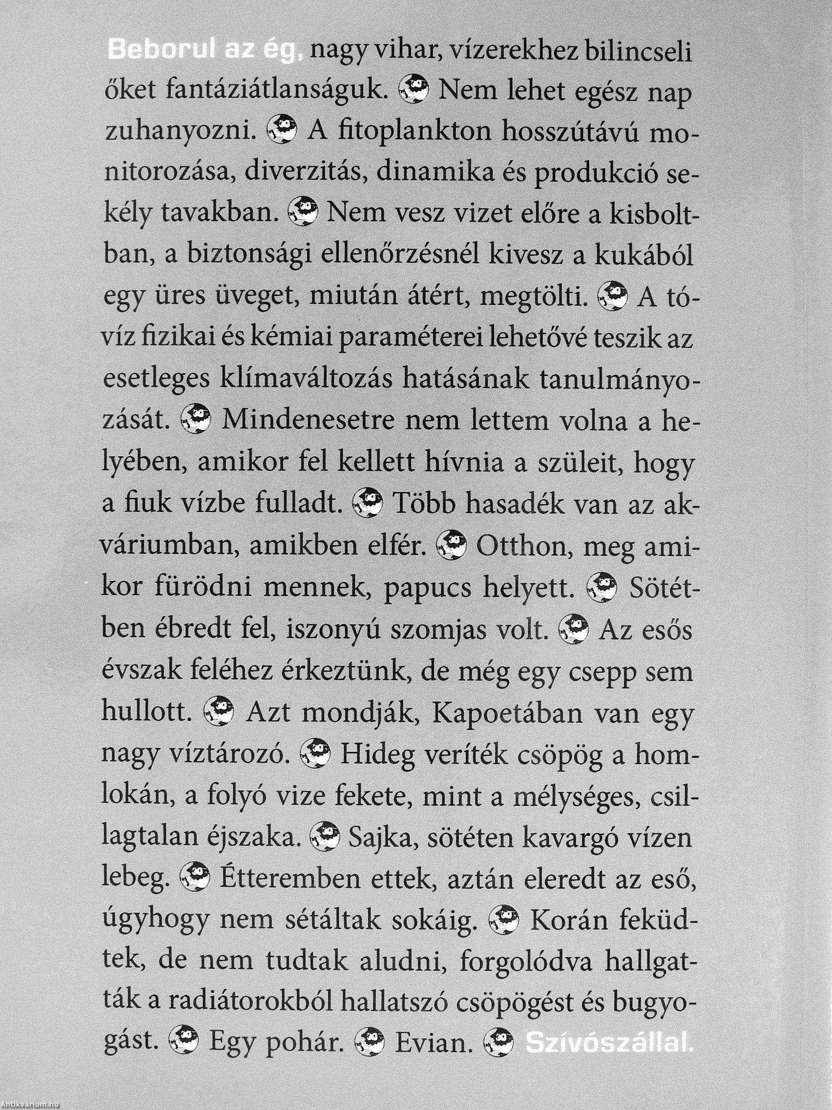 nagy vihar, vízerekhez bilincseli őket fantáziátlanságuk. @ Nem lehet egész nap zuhanyozni. @ A íitoplankton hossziítávú monitorozása, diverzitás, dinamika és produkció sekély tavakban. @ Nem vesz vizet előre a kisboltban, a biztonsági ellenőrzésnél kivesz a kukából egy üres üveget, miután átért, megtölti. @ A tó-víz fizikai és kémiai paraméterei lehetővé teszik az esetleges klímaváltozás hatásának tanulmányozását. @ Mindenesetre nem lettem volna a helyében, amikor fel kellett hívnia a szüleit, hogy a fiuk vízbe fulladt. ® Több hasadék van az akváriumban, amikben elfér. @ Otthon, meg amikor fürödni mennek, papucs helyett. ©> Sötétben ébredt fel, iszonytí szomjas volt. @ Az esős évszak feléhez érkeztünk, de még egy csepp sem hullott. @ Azt mondják, Kapoetában van egy nagy víztározó. @ Hideg veríték csöpög a homlokán, a folyó vize fekete, mint a mélységes, csillagtalan éjszaka. @ Sajka, sötéten kavargó vízen lebeg. ® Étteremben ettek, aztán eleredt az eső, úgyhogy nem sétáltak sokáig. @ Korán feküdtek, de nem tudtak aludni, forgolódva hallgatták a radiátorokból hallatszó csöpögést és bugyo-gást. ® Egy pohár. ® Evian. #