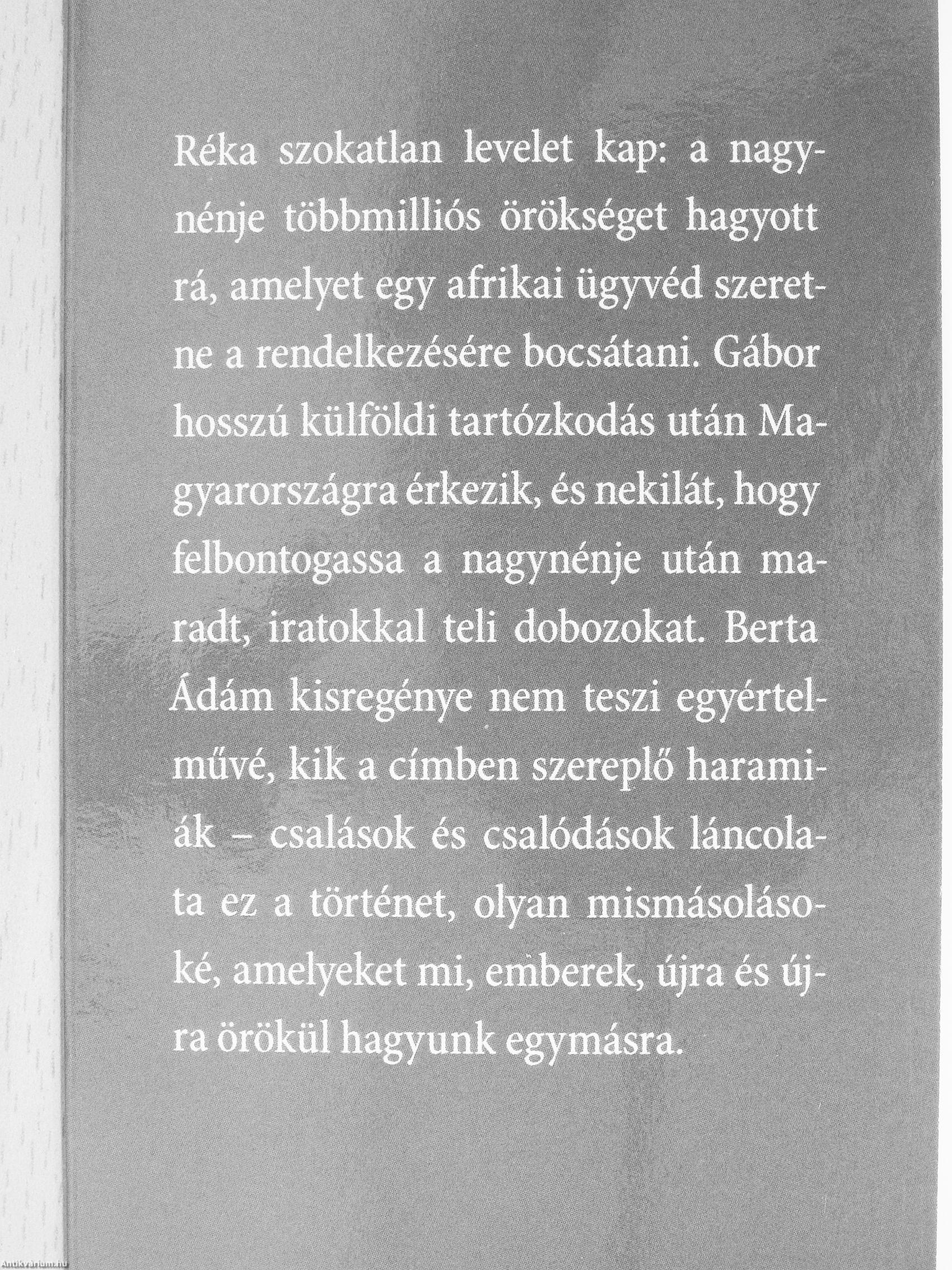 Réka szokatlan levelet kap: a nagynénje többmilliós örökséget hagyott rá, amelyet egy afrikai ügyvéd szeretne a rendelkezésére bocsátani. Gábor hosszú külföldi tartózkodás után Magyarországra érkezik, és nekilát, hogy felbontogassa a nagynénje után maradt, iratokkal teli dobozokat. Berta Ádám kisregénye nem teszi egyértelművé, kik a címben szereplő haramiák - csalások és csalódások láncolata ez a történet, olyan mismásolásoké, amelyeket mi, emberek, újra és újra örökül hagyunk egymásra. Vissza