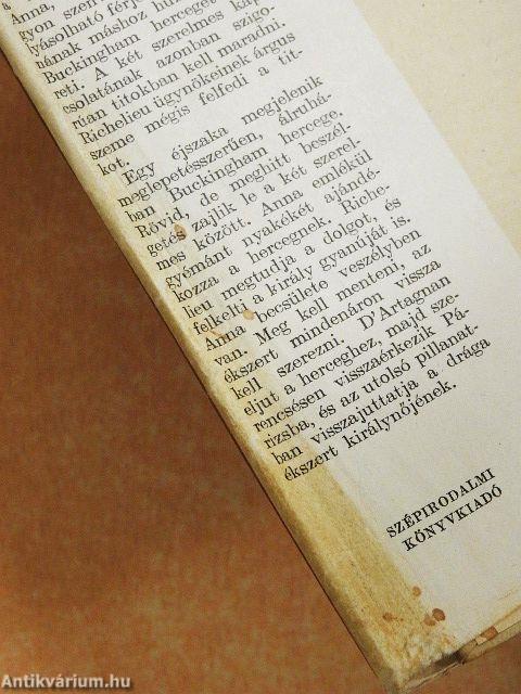 "A három testőr" Dumas egyik legismertebb és legkedveltebb regénye. Az író Richelieu bíboros korába enged bepillantást az olvasónak: zajlik az udvari élet, a titkos megbeszélések, intrikák, politikai gyilkosságok, gonosztettek napirenden vannak. Ebben a légkörben él Ausztriai Anna, a királynő, aki nagyon szenved durva, befolyásolható férje mellett. Annának máshoz húz a szíve, Buckingham herceget szereti. A két szerelmes kapcsolatának azonban szigorúan titokban kell maradni. Richelieu ügynökeinek árgus szeme mégis felfedi a titkot. Egy éjszaka megjelenik meglepetésszerűen, álruhában, Buckingham hercege. Rövid, de meghitt beszélgetés zajlik le a két szerelmes között. Anna emlékül gyémánt nyakékét ajándékozza a hercegnek. Richelieu megtudja a dolgot, és felkelti a király gyanúját is. Anna becsülete veszélyben van. Meg kell menteni, az ékszert mindenáron vissza kell szerezni. D'Artagnan eljut a herceghez, majd szerencsésen visszaérkezik Párizsba, és az utolsó pillanatban visszajuttatja... Tovább