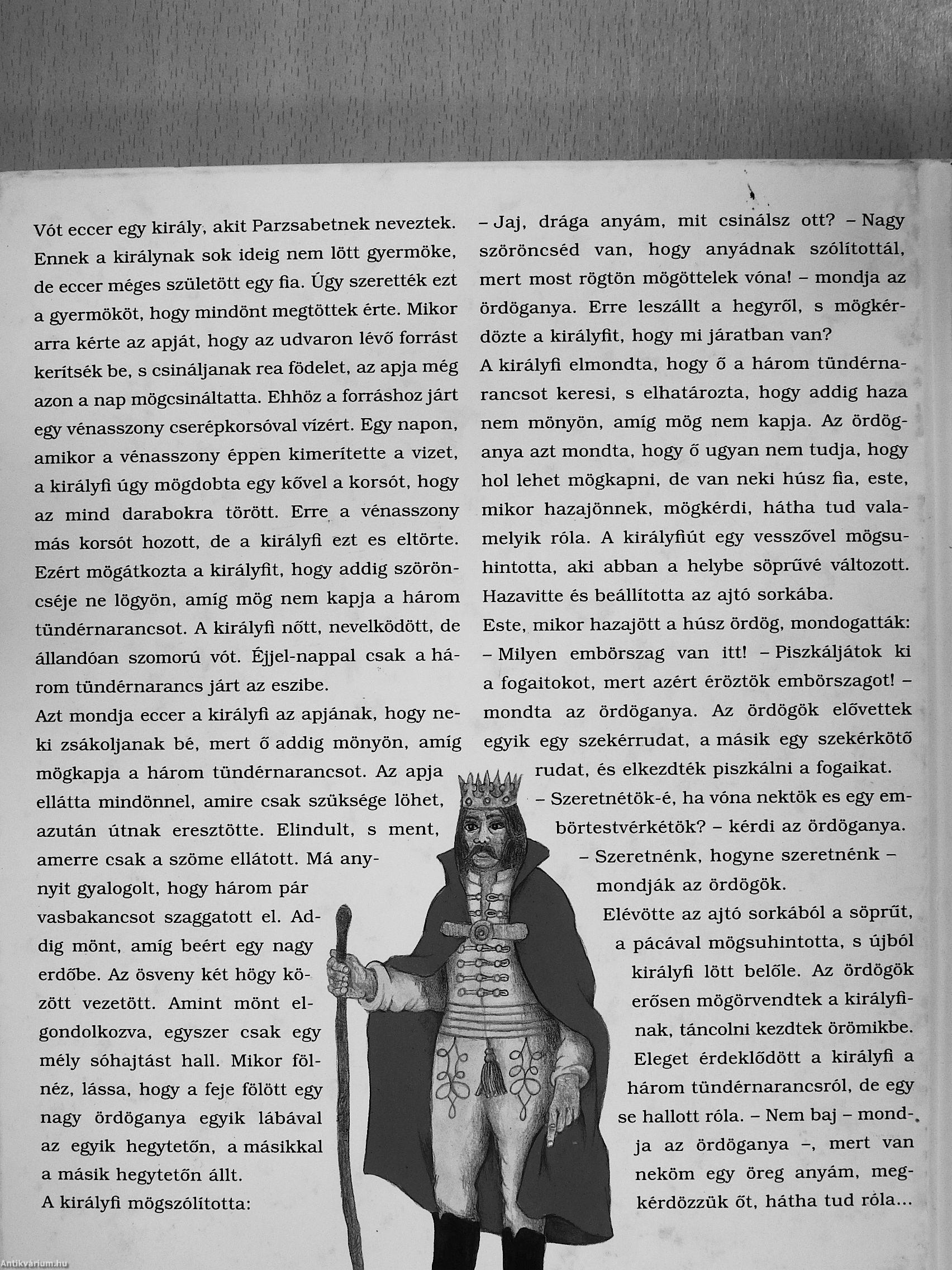 Vót eccer egy király, akit Parzsabetnek neveztek. Ennek a királynak sok ideig nem lött gyermöke, de eccer méges születött egy fia. Úgy szerették ezt a gyermököt, hogy mindönt megtöttek érte. Mikor arra kérte az apját, hogy az udvaron lévő forrást kerítsék be, s csináljanak rea födelet, az apja még azon a nap mögcsináltatta. Ehhöz a forráshoz járt egy vénasszony cserépkorsóval vízért. Egy napon, amikor a vénasszony éppen kimerítette a vizet, a királyfi úgy mögdobta egy kővel a korsót, hogy az mind darabokra törött. Erre a vénasszony más korsót hozott, de a királyfi ezt es eltörte. Ezért mögátkozta a királyfit, hogy addig szörön-cséje ne lögyön, amíg mög nem kapja a három tündérnarancsot. A királyfi nőtt, nevelködött, de állandóan szomorú vót. Éjjel-nappal csak a három tündérnarancs járt az eszibe. Azt mondja eccer a királyfi az apjának, hogy neki zsákoljanak bé, mert S addig mönyön, amíg mögkapja a három tündérnarancsot. Az apja ellátta mindönnel, amire csak szüksége lőhet, azután útnak eresztötte. Elindult, s ment, amerre csak a szöme ellátott. Má any-nylt gyalogolt, hogy három pár vasbakancsot szaggatott el. Addig mönt, amíg beért egy nagy erdőbe. Az ösvény két högy között vezetött. Amint mönt elgondolkozva, egyszer csak egy mély sóhajtást hall. Mikor fölnéz, lássa, hogy a feje fölött egy nagy ördöganya egyik lábával az egyik hegytetőn, a másikkal a másik hegytetőn állt. A királyfi mögszólitotta: