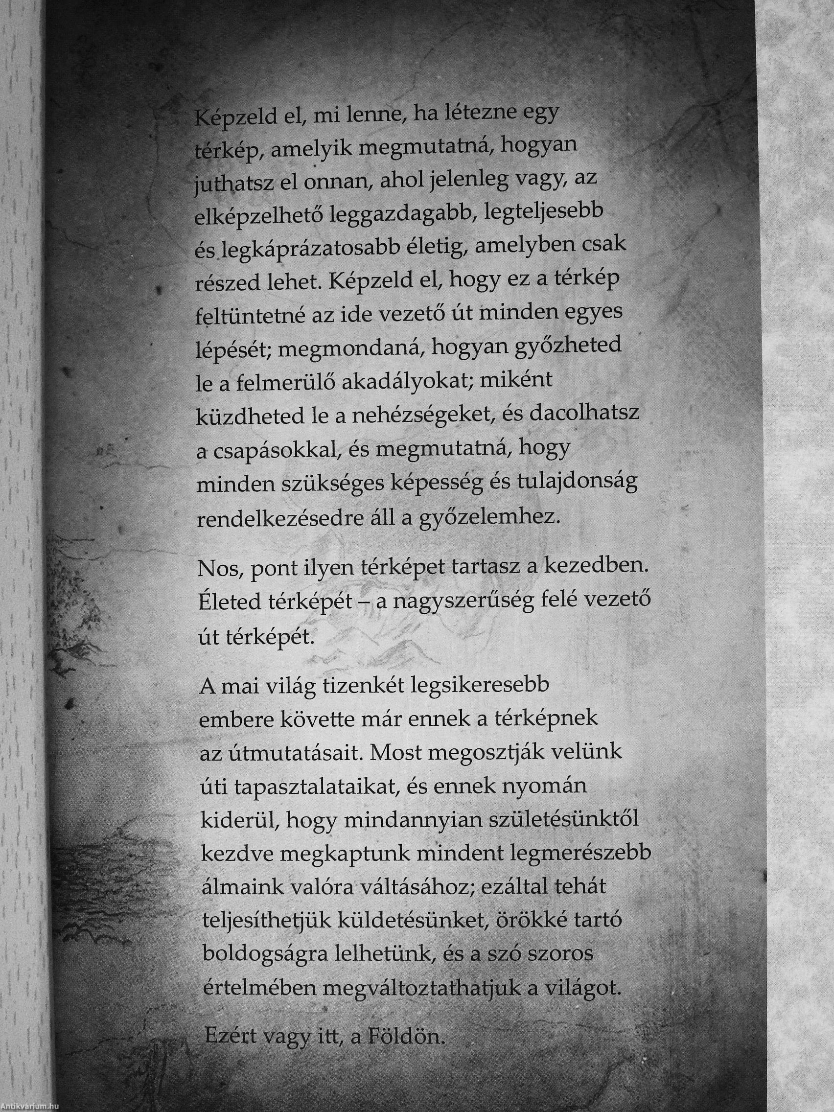 H^épzeld el, mi leraie, ha létezne egy térkép, amelyik megmutatná, hogyan juthatsz el onnan, ahol jelenleg vagy, az elképzelhető leggazdagabb, legteljesebb és.legkáprázatosabb életig, amelyben csak részed lehet. Képzeld el, hogy ez a térkép feltüntetné az ide vezető út minden egyes lépését; megmondaná, hogyan győzheted le a felmerülő akadályokat; miként küzdheted le a nehézségeket, és dacolhatsz a csapásokkal, és megmutatná, hogy minden szükséges képesség és tulajdonság rendelkezésedre áll a győzelemhez.