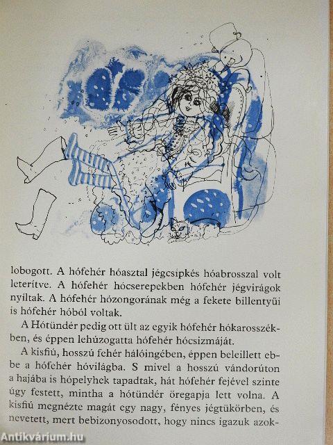 "Hol volt, hol nem volt, volt egyszer egy kisfiú. Ez a kisfiú kinézett az asblakon, és rögtön látta, hogy az éjszaka a földön járt a Hótündér, mert ameddig a szem ellátott, mindent, de mindent szép fehér hótakaró borított, és a szép fehér hótakarón még délben is tisztán látszott a tündér jégcsizmácskájának sok apró nyoma. Az ablakpárkányon fehérlő hópárna még azt is elárulta, hogy a Hótündér még oda is felröppent."