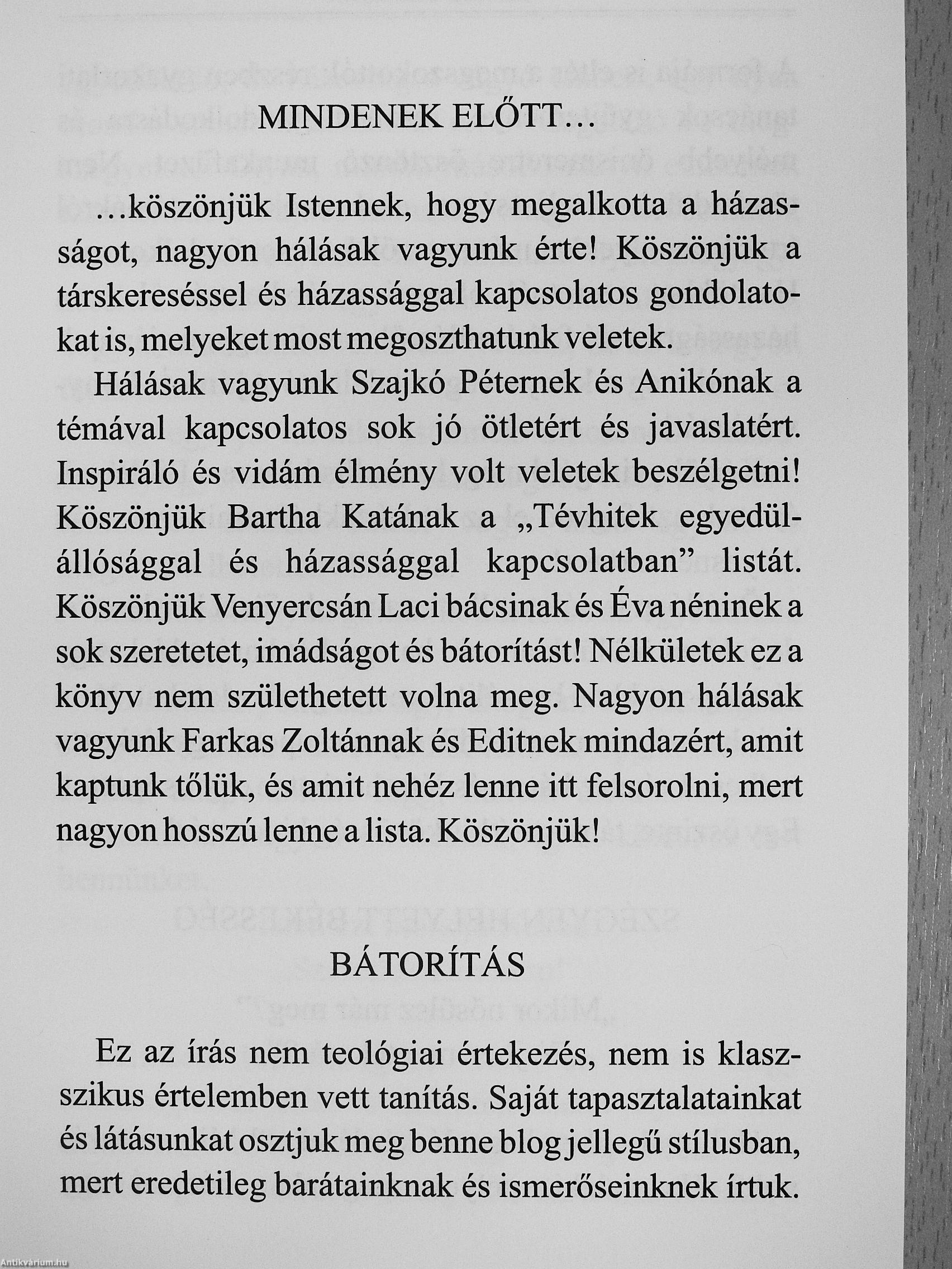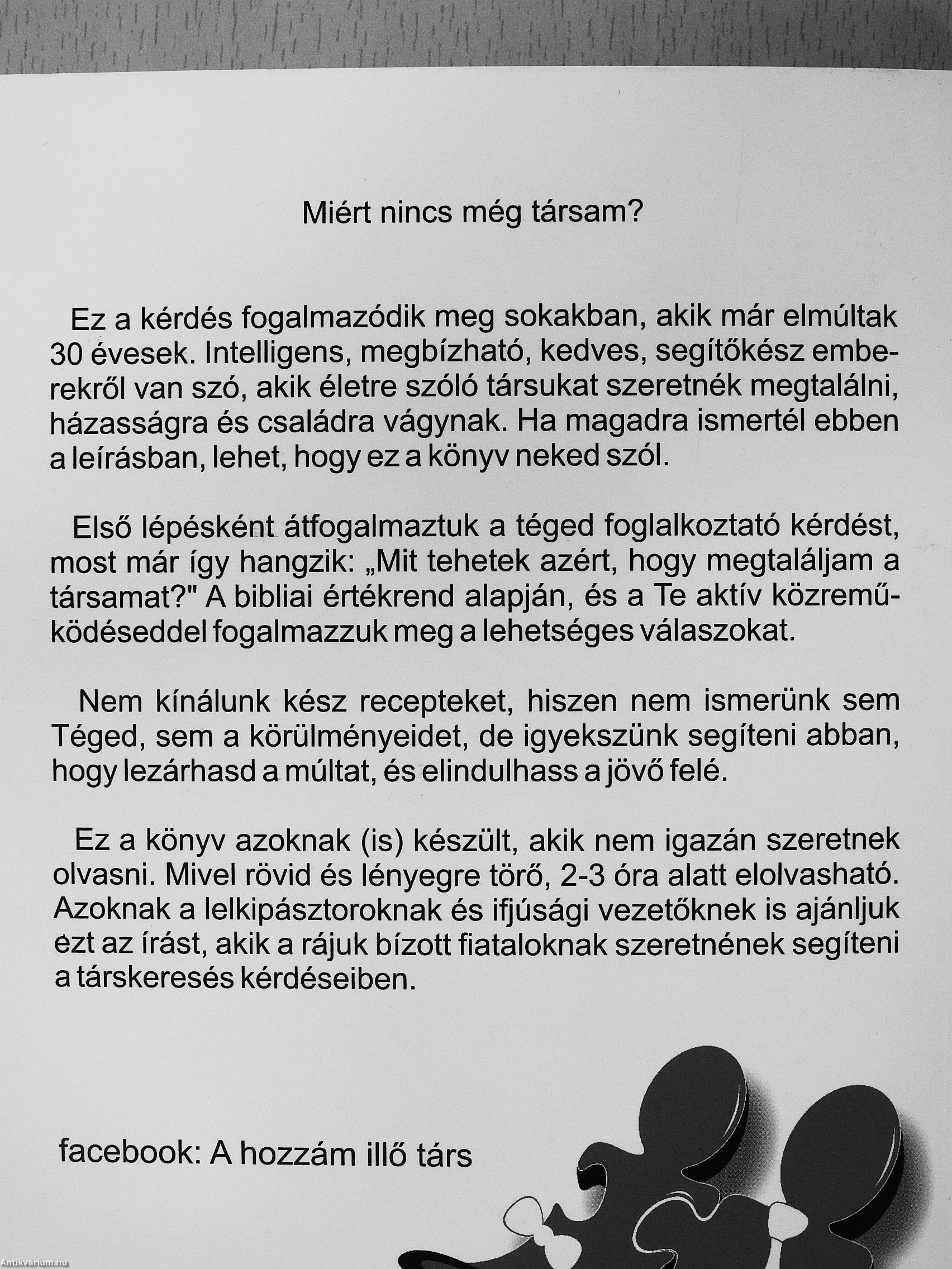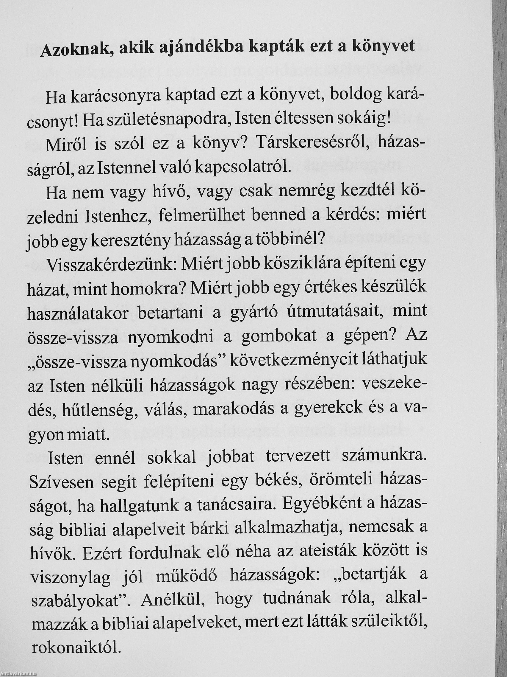 Ez a könyv azoknak (is) készült, akik nem igazán szeretnek olvasni. Mivel rövid és lényegre törő, 2-3 óra alatt elolvasható. Azoknak a lelkipásztoroknak és ifjúsági vezetőknek is ajánljuk ezt az írást, akik a rájuk bízott fiataloknak szeretnének segíteni a társkeresés kérdéseiben.