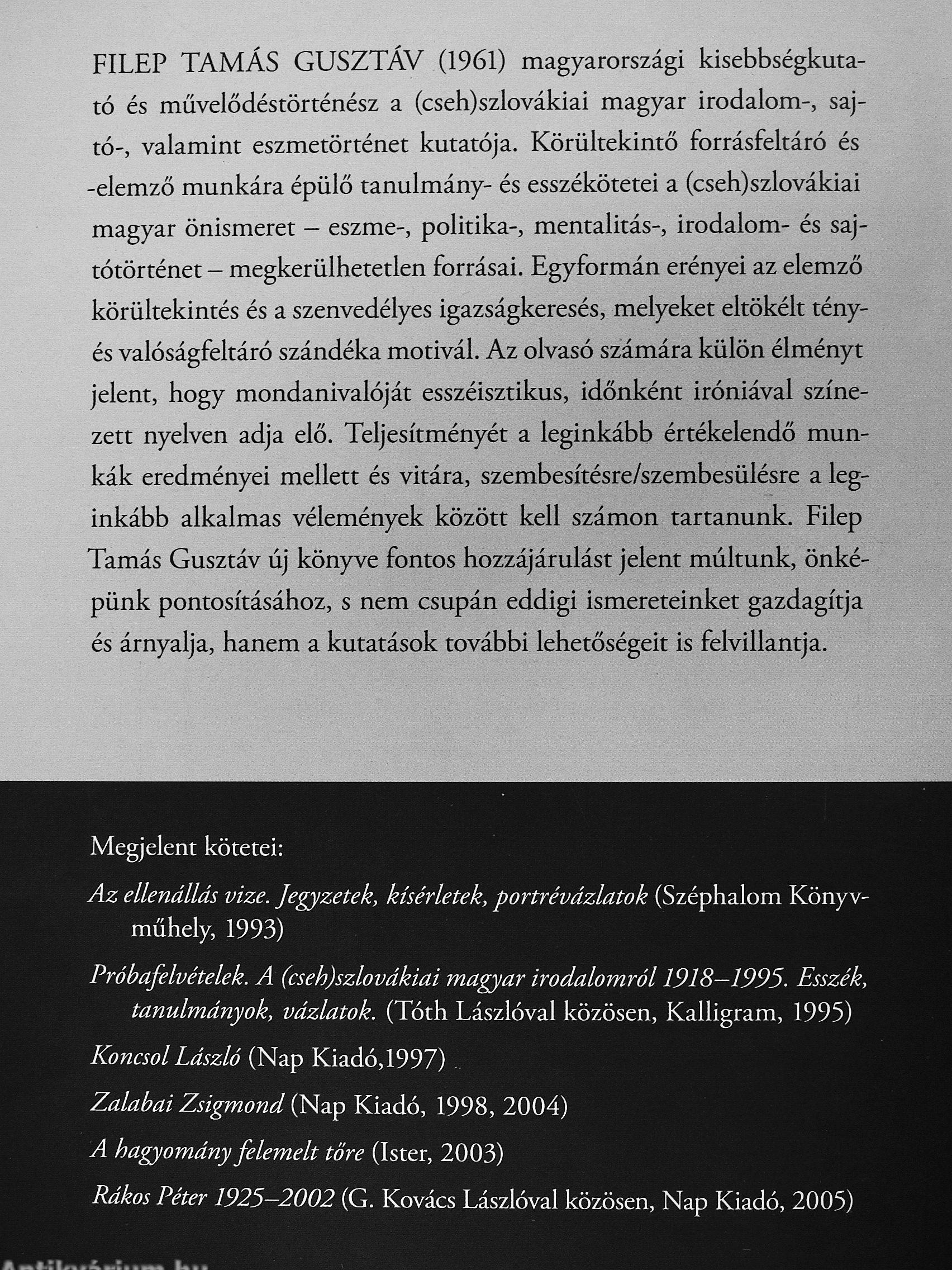 FILEP TAMÁS GUSZTÁV (1961) magyarországi kisebbségkutató és művelődéstörténész a (cseh)szIovákiai magyar irodalom-, sajtó-, valamint eszmetörténet kutatója. Körültekintő forrásfeltáró és -elemző munkára épülő tanulmány- és esszékötetei a (cseh) szlovákiai magyar önismeret - eszme-, politika-, mentalitás-, irodalom- és sajtótörténet - megkerülhetetlen forrásai. Egyformán erényei az elemző körültekintés és a szenvedélyes igazságkeresés, melyeket eltökélt tény-és valóságfeltáró szándéka motivál. Az olvasó szamára külön élményt jelent, hogy mondanivalóját esszéisztikus, időnként iróniával színezett nyelven adja elő. Teljesítményét a leginkább értékelendő munkák eredményei mellett és vitára, szembesítésre/szembesülésre a leginkább alkalmas vélemények között kell számon tartanunk. Filep Tamás Gusztáv új könyve fontos hozzájárulást jelent múltunk, önképünk pontosításához, s nem csupán eddigi ismereteinket gazdagítja és árnyalja, hanem a kutatások további lehetőségeit is felvillantja.