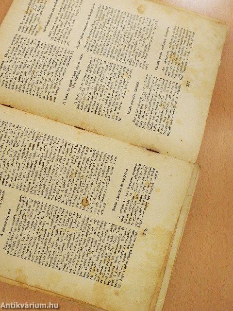 A gerinc hiányzik. A kötéstáblák elváltak a könyvtesttől, az ívek különváltak egymástól. A borító foltos, kopott. A lapélek és több lap foltos. A 449-450. oldal hiányzik a könyvből. Néhány lapon bejegyzések, az előzéklapon ajándékozási bejegyzés található.