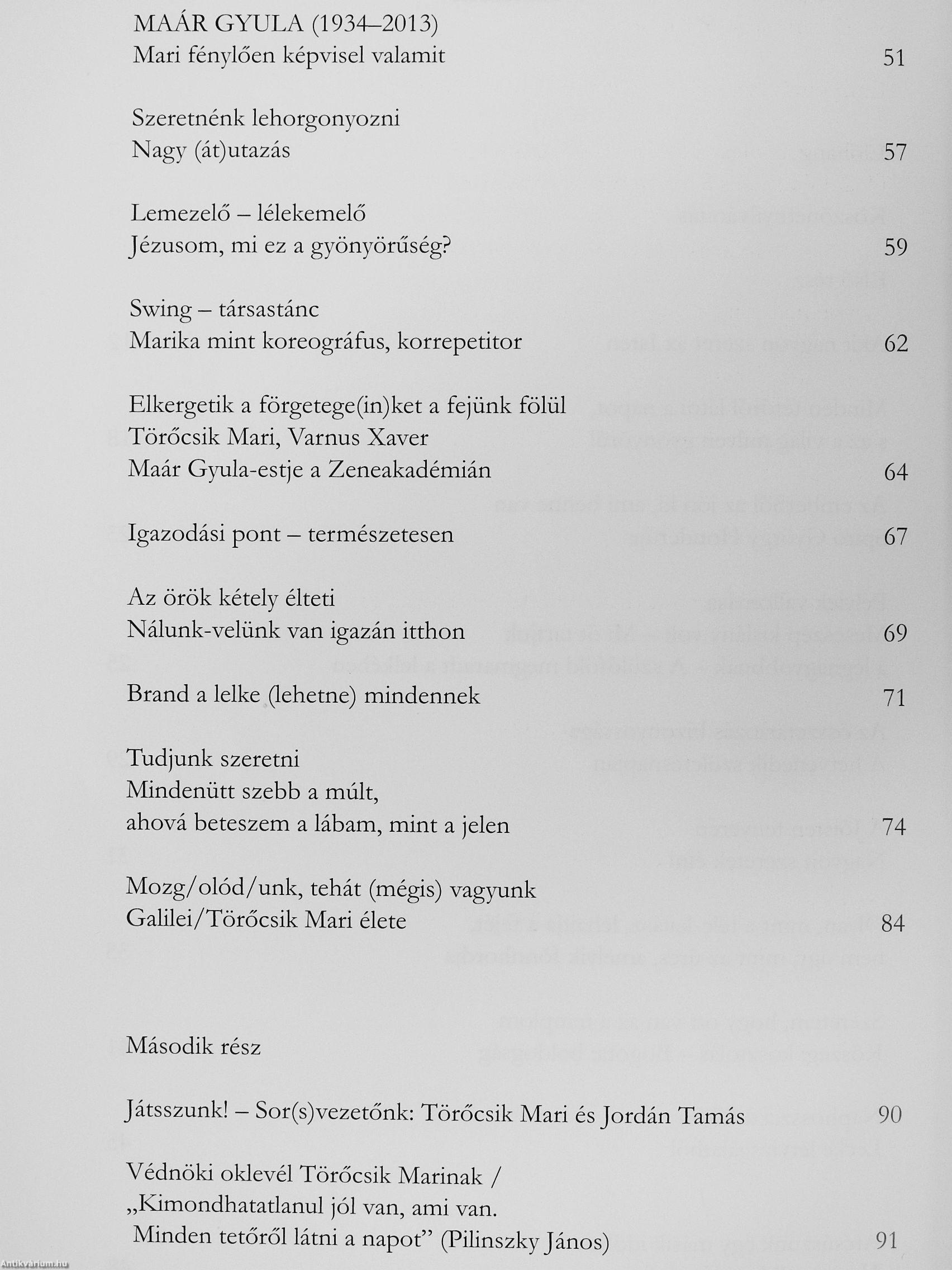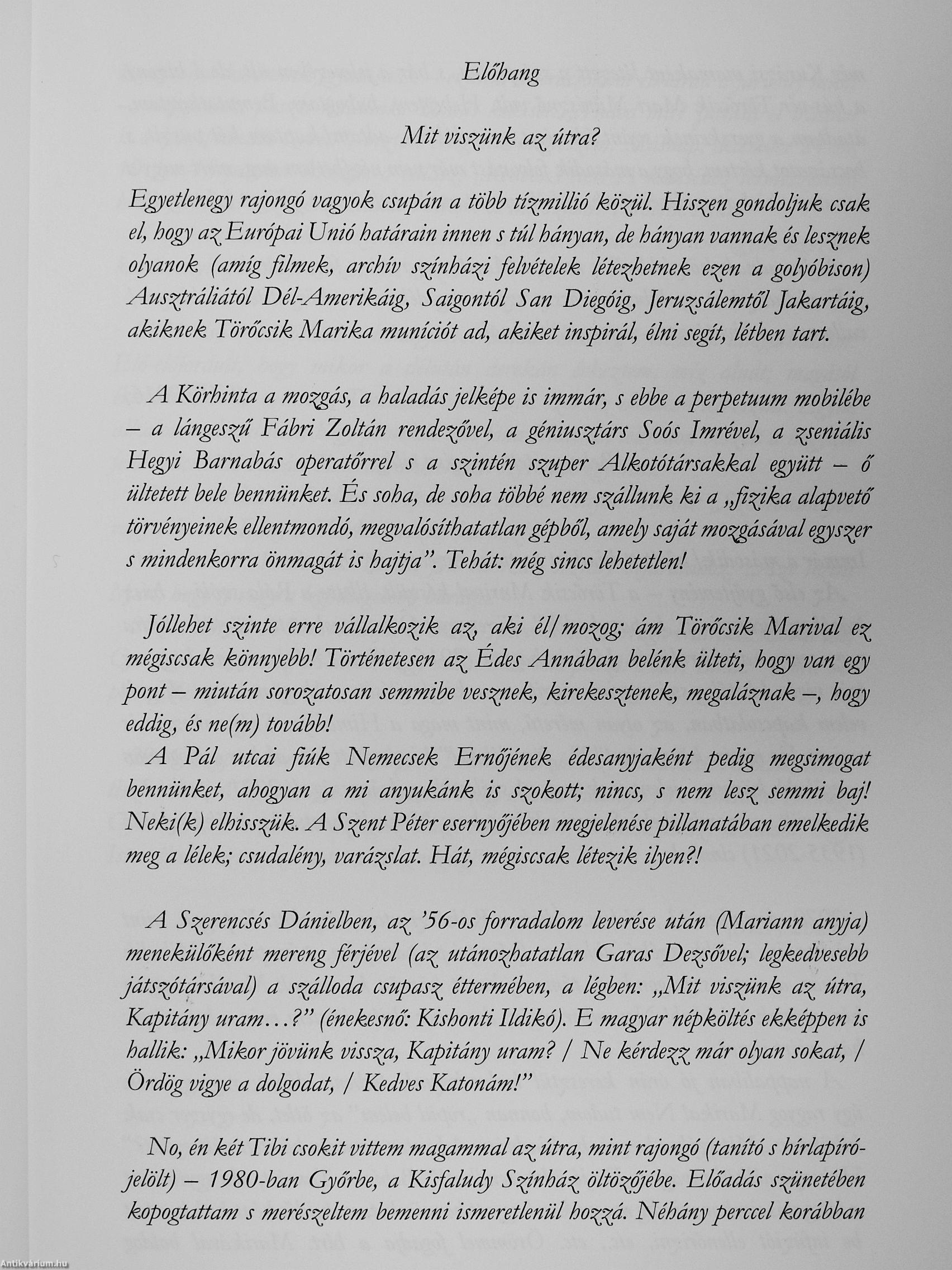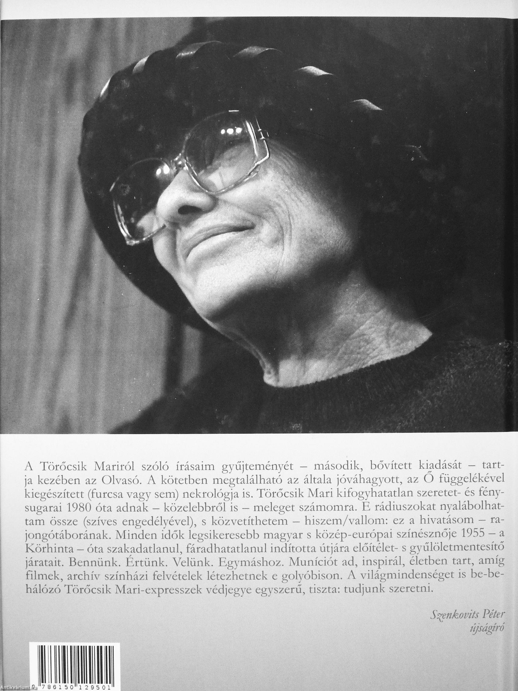A Tcirőcsik Mariról S2(')ló írásaim gyűjteményét - második, bővített kiadását - tartja kezében az Olvasó. A kötetben megtalálható az általa jóváhagyott, az függelékével kiegészített (furcsa vagy sem) nekrológja is. Törőcsik Mari kifogyhatatlan szeretet- és fénysugarai 1980 óta adnak - közelebbről is — meleget számomra. E rádiuszokat nyalábolhattam össze (szíves engedélyével), s közvetíthetem - hiszem/vallom: ez a hivatásom - rajongótáborának. Minden idők legsikeresebb mag\'ar s közép-európai színésznője 1955 — a Körhinta - óta szakadatlanul, fáradhatatlanul indította útjára előítélet- s gyűlciletmentesíto járatait. Bennünk. Értünk. Velünk. Egymáshoz. Muníciót ad, inspirál, életben tart, amíg filmek, archív színházi felvételek létezhetnek e golyóbis(jn. A világmindenséget is be-be-hálózó Törőcsik Mari-expresszek védjegye egyszerű, tiszta: tudjunk szeretni.