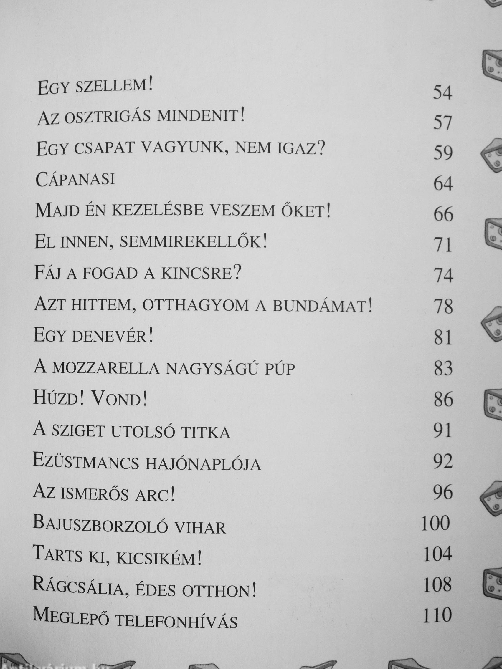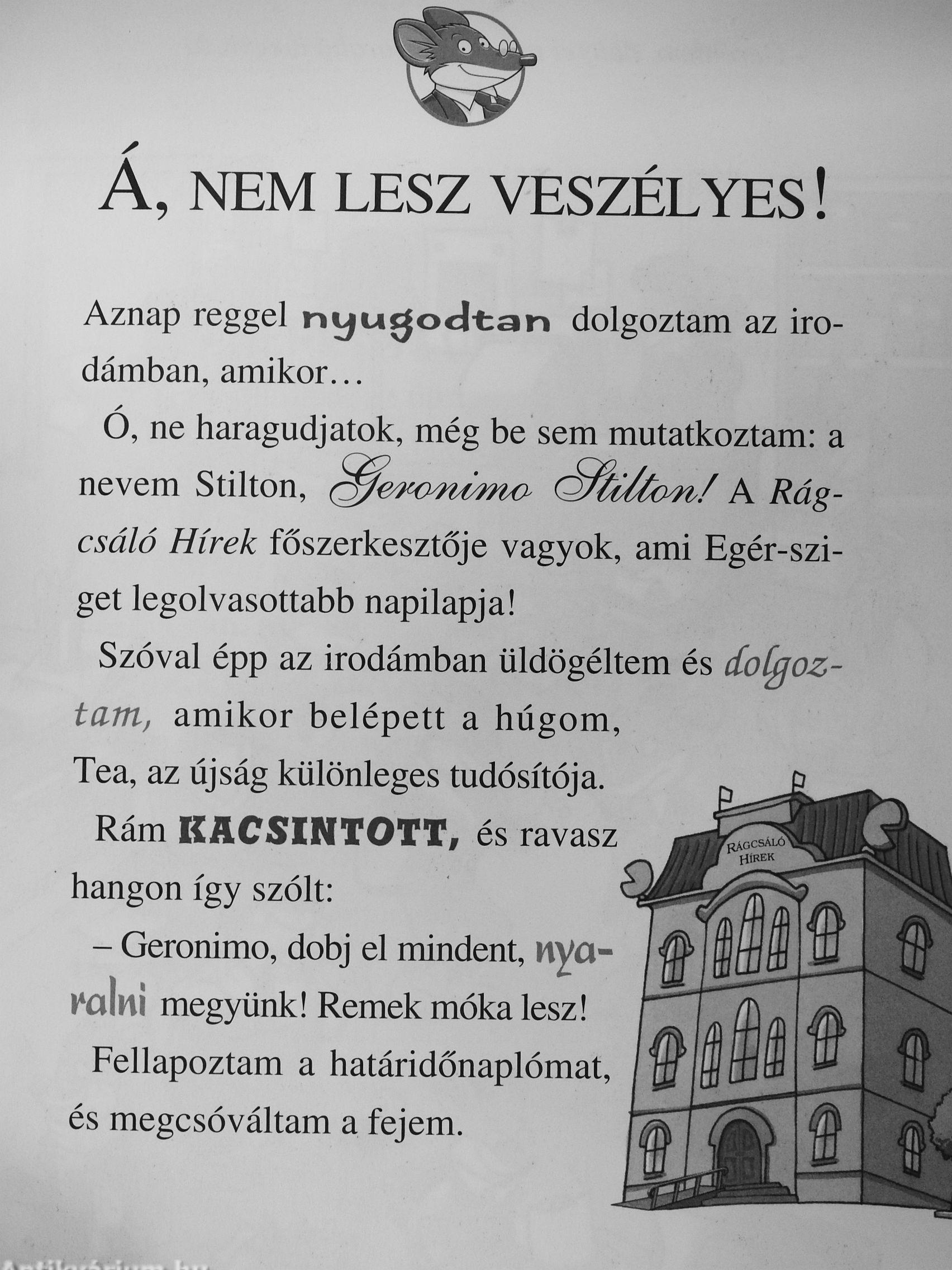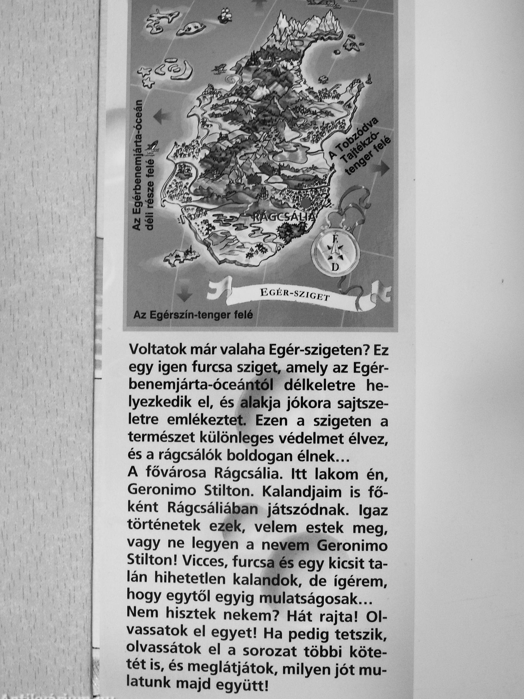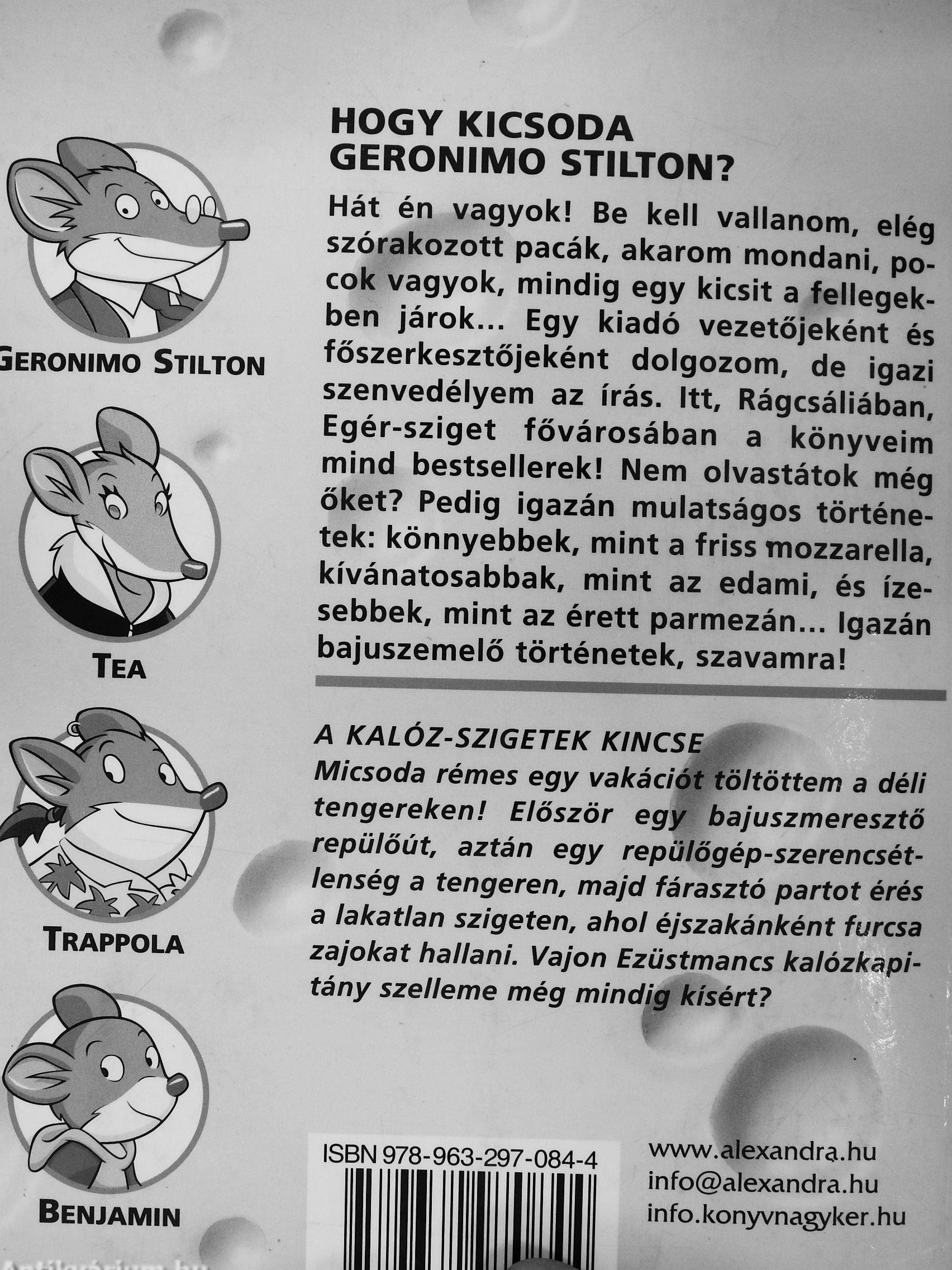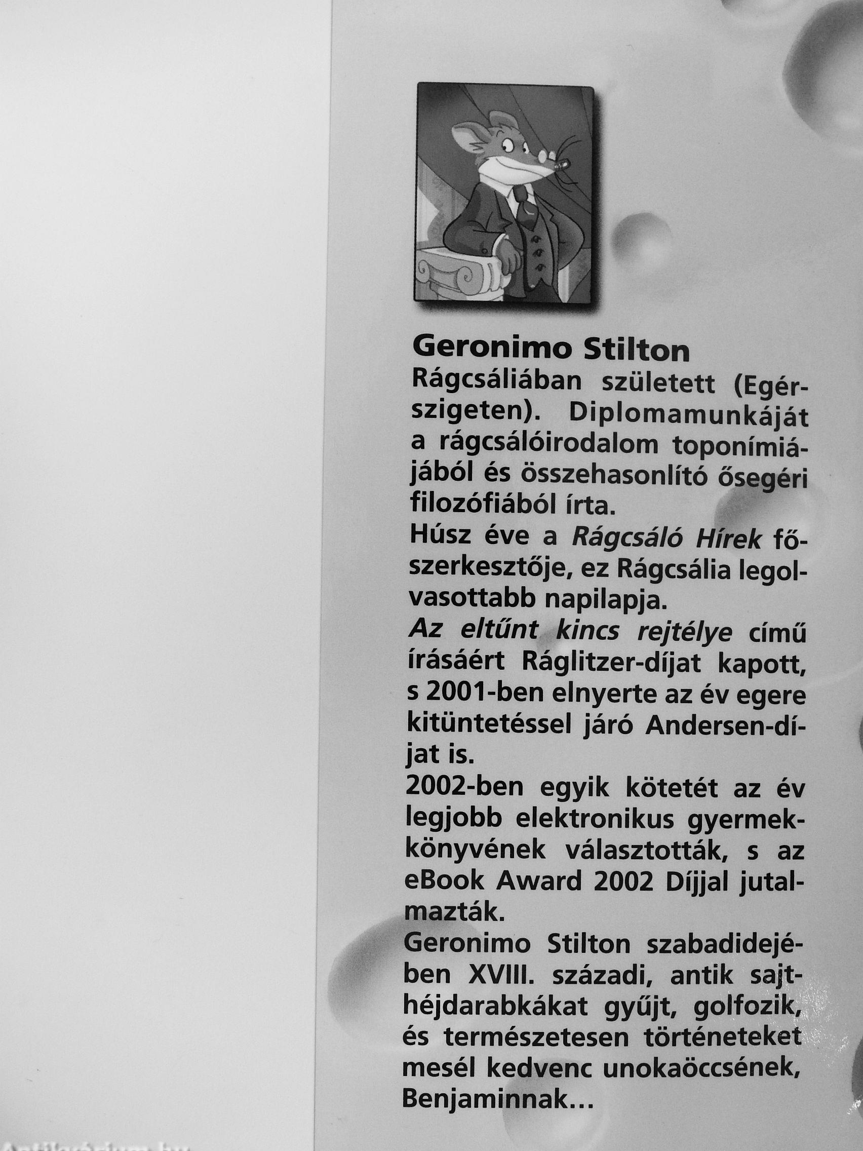 Voltatok már valaha Egér-szigeten? Ez egy igen furcsa sziget, amely az Egér-benemjárta-óceántól délkeletre helyezkedik el, és alakja jókora sajtszeletre emlékeztet. Ezen a szigeten a természet különleges védelmet élvez, és a rágcsálók boldogan élnek A fővárosa Rágcsália. Itt lakom én, Geronimo Stilton. Kalandjaim is főként Rágcsáliában játszódnak. Igaz történetek ezek, velem estek meg, vagy ne legyen a nevem Geronimo stilton! Vicces, furcsa és egy kicsit talán hihetetlen kalandok, de ígérem, hogy egytől egyig mulatságosak Nem hisztek nekem? Hát rajta! Olvassatok el egyet! Ha pedig tetszik, olvassátok el a sorozat többi kötetét is, és meglátjátok, milyen jót mulatunk majd együtt!