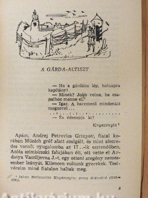 Apám, Andrej Petrovics Grinyov, fiatal korában Münich gróf alatt szolgált, és mint alezredes vonult nyugalomba az 17...-ik esztendőben. Azóta szimbirszki falujában élt, ott vette el Avdotya Vasziljevna J.-t, egy ottani szegény nemesember leányát. Kilencen voltunk gyerekek. Testvéreim mind fiatalon haltak meg. Anyám még másállapotban volt velem, amikor engem egyik közeli rokonunk, B. herceg gárda-őrnagynak jóvoltából bejegyeztek kadétnak a Szemjonov-ezredbe. Ha anyám minden várakozás ellenére történetesen leányt szül, akkor apám illetékes helyen bejelenti a be nem vonult kadét halálát, és ezzel a dolog rendben is lett volna. Iskolázásom befejezéséig szabadságoltnak számítottam. Abban az időben másképp nevelkedtünk, mint manapság. Ötéves koromban Szavelicsnek, a lovásznak gondjaira bíztak, akit józanságáért léptettek elő szárazdajkámmá. Az ő felügyelete alatt tizenkét éves koromra megtanultam írni-olvasni, és igen bölcsen tudtam az agarak tulajdonságainak kérdéséhez hozzászólni. Ez időben szerződtetett hozzám édesapám francia tanitót, Beaupré urat, akit Moszkvából hozatott az évi bor- és asztaliolaj-szükségletével együtt. A tanító megérkezése nagyon nem tetszett Szavelicsnek.