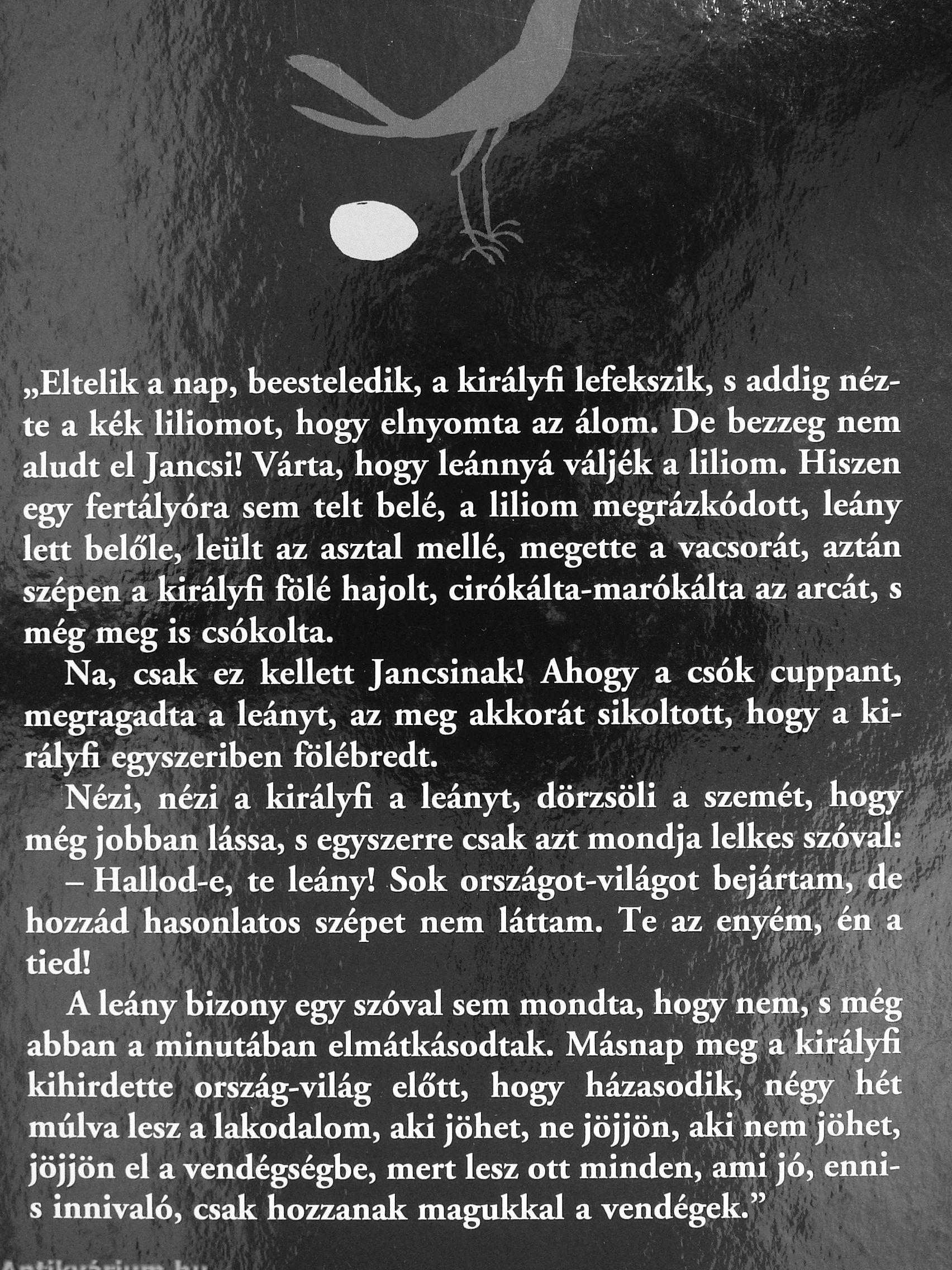 „Eltelik a nap, beesteledik, a királyfi lefekszik, s addig nézte a kék liliomot, hogy elnyomta az álom. De bezzeg nem aludt el Jancsi! Várta, hogy leánnyá váljék a liliom. Hiszen egy fertályóra sem telt belé, a liliom megrázkódott, leány lett belőle, leült az asztal mellé, megette a vacsorát, aztán szépen a királyfi fölé hajolt, cirókálta-marókálta az arcát, s még meg is csókolta.