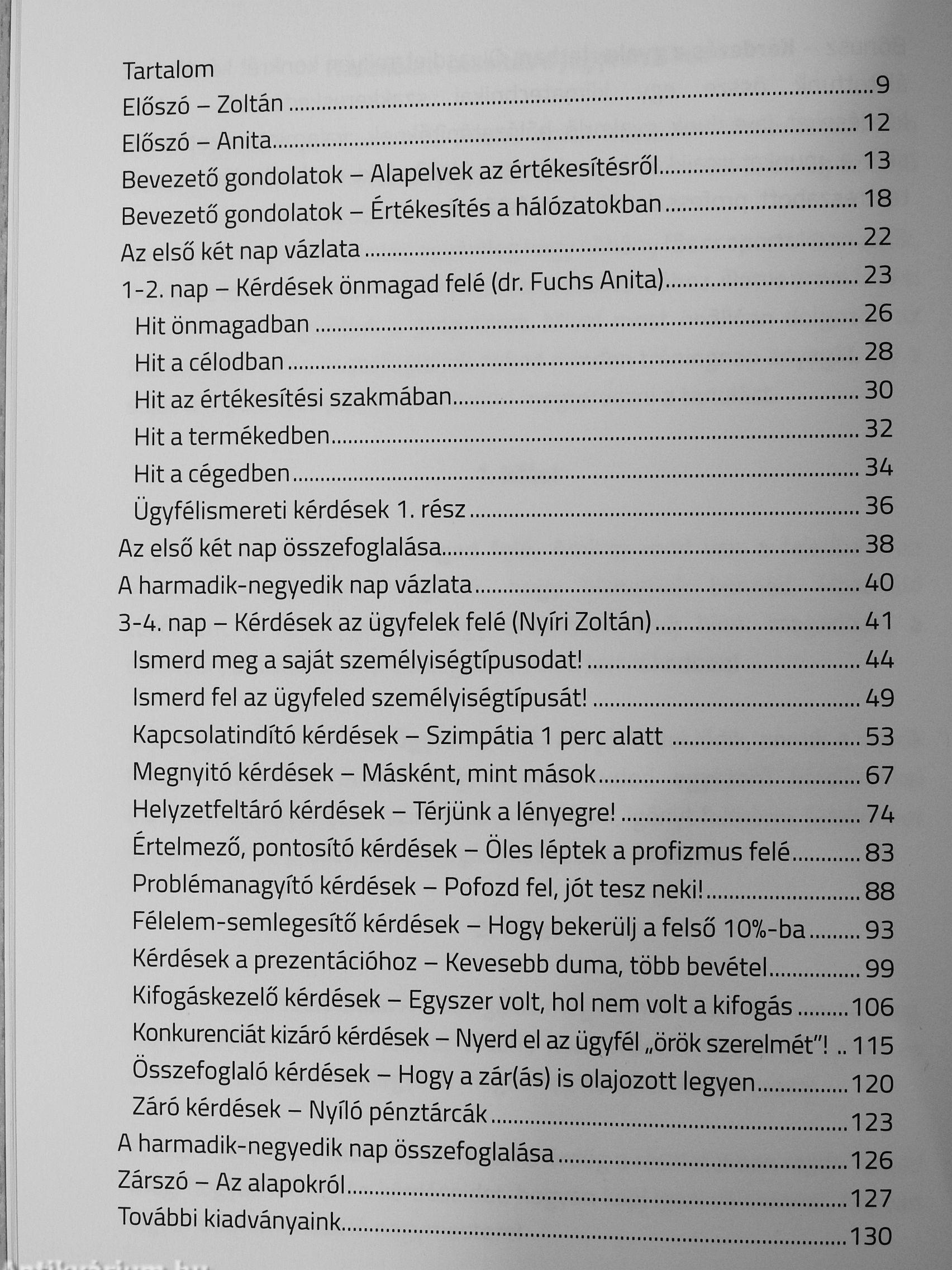 Valójában ez egy professzionális technikai anyag, az egyik legnépszerűbb képzésünk, a hatnapos „Kérdezéstechnika értékesítőknek" tréningsorozat kivonata. Ezt a programot az elmúlt években kizárólag cégek megrendelésére, zárt körben szállítottuk, most először tárjuk nagy nyilvánosság elé. Az idők során összegyűlt ipari mennyiségű eladástechnikai információ kerül benne bemutatásra részletes tréneri magyarázatokkal, számtalan példával és konkrét gyakorlatokkal. Főbb témaköreink a következők: