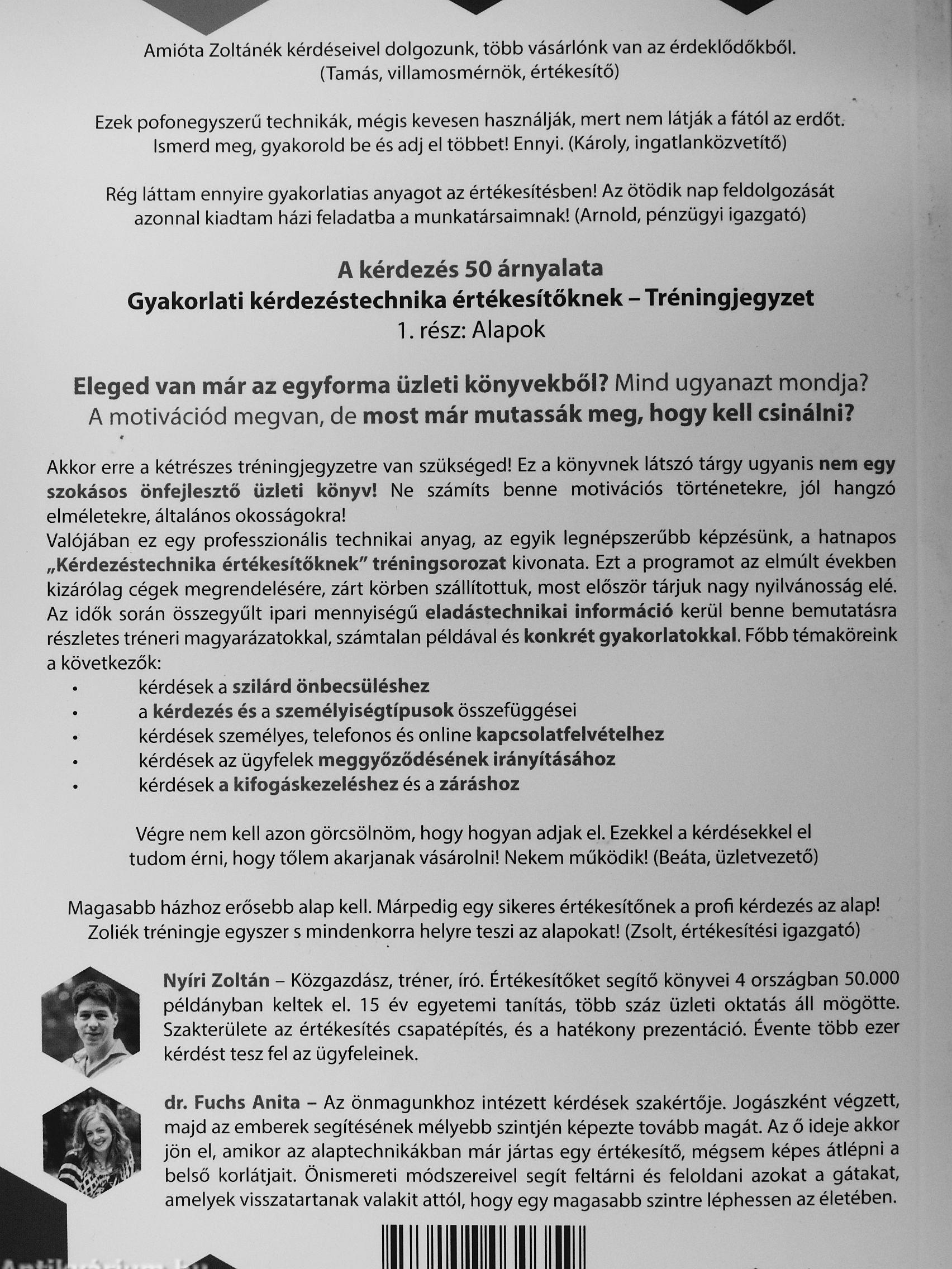 Nyíri Zoltán - Közgazdász, tréner, író. Értékesítőket segítő könyvei 4 országban 50.000 példányban keltek el. 15 év egyetemi tanítás, több száz üzleti oktatás áll mögötte. ^ ÍH Szakterülete az értékesítés csapatépítés, és a hatékony prezentáció. Évente több ezer kérdést tesz fel az ügyfeleinek.