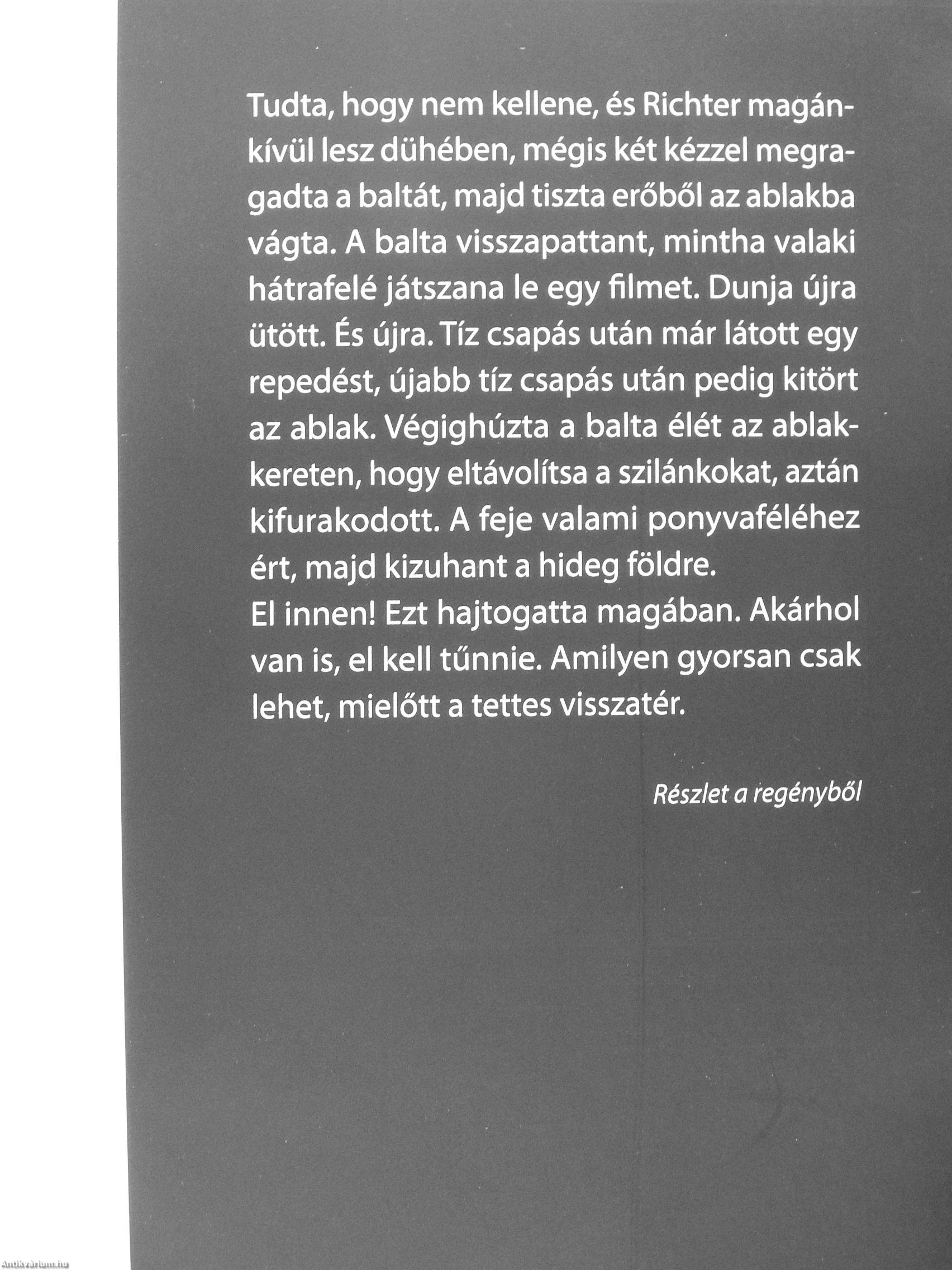 Tudta, hogy nem kellene, és Richter magánkívül lesz dühében, mégis két kézzel megragadta a baltát, majd tiszta erőből az ablakba vágta. A balta visszapattant, mintha valaki hátrafelé játszana le egy filmet. Dunja újra ütött. És újra. Tíz csapás után már látott egy repedést újabb tíz csapás után pedig kitört az ablak. Végighúzta a balta élét az ablakkereten, hogy eltávolítsa a szilánkokat, aztán kifurakodott. A feje valami ponyvaféléhez ért, majd kizuhant a hideg földre. El innen! Ezt hajtogatta magában. Akárhol van is, el kell tűnnie. Amilyen gyorsan csak lehet, mielőtt a tettes visszatér.