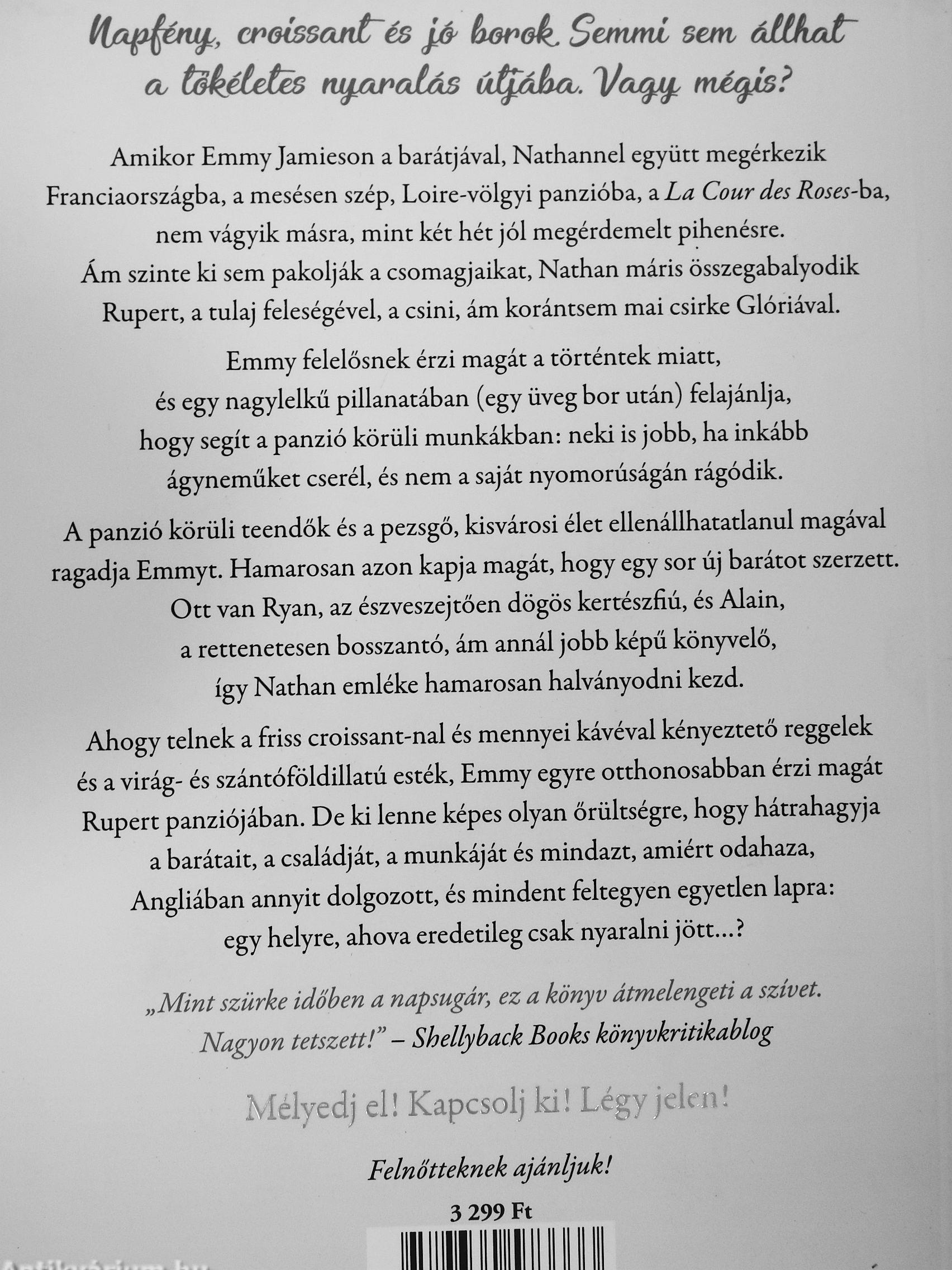 Amikor Emmy Jamieson a barátjával, Nathannel együtt megérkezik Franciaországba, a mesésen szép, Loire-völgyi panzióba, a La Cour des Roses-hz, nem vágyik másra, mint két hét jól megérdemelt pihenésre. Ám szinte ki sem pakolják a csomagjaikat, Nathan máris összegabalyodik Rupert, a tulaj feleségével, a csini, ám korántsem mai csirke Glóriával.