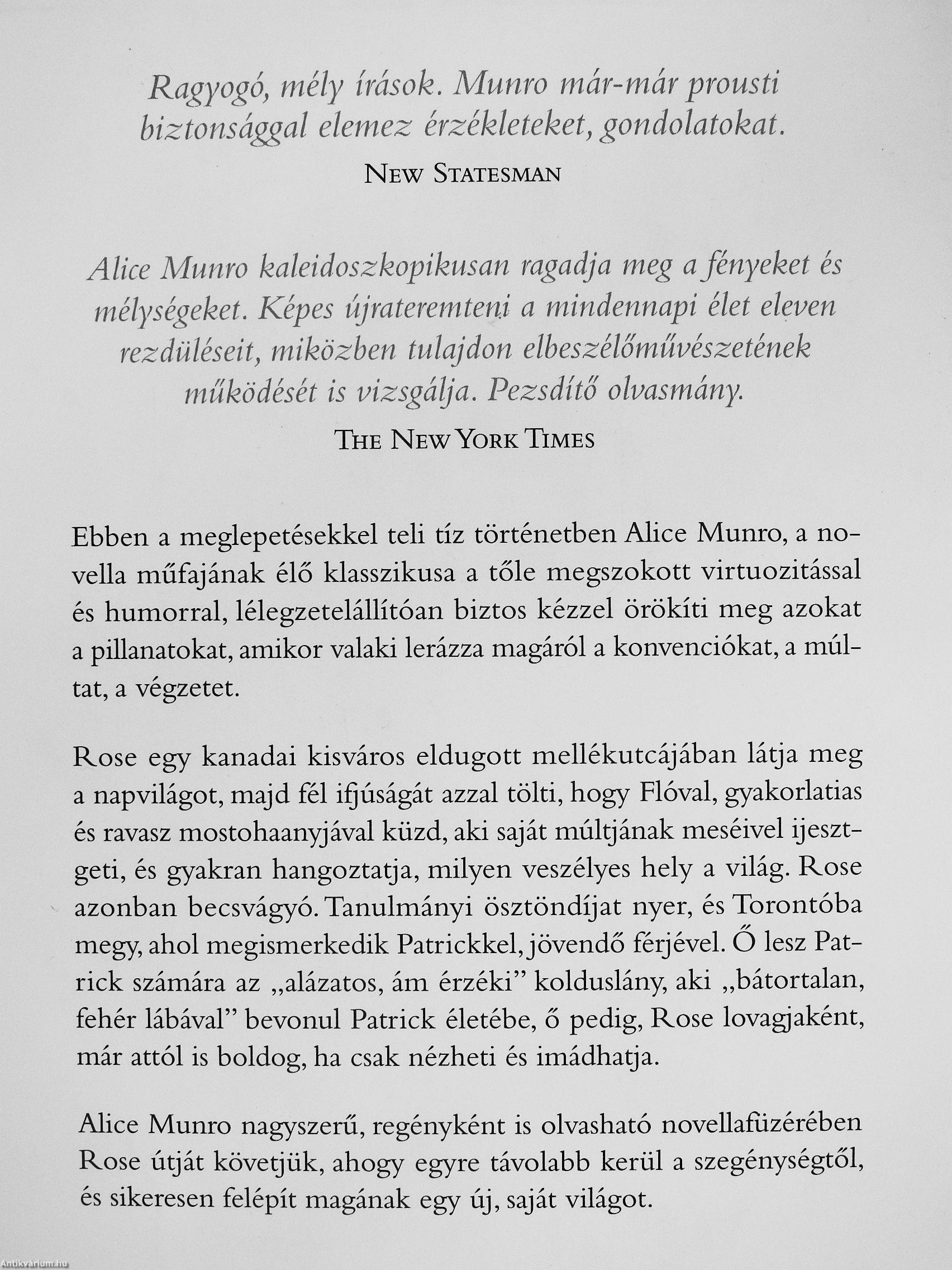 Alice Munro nagyszerű, regényként is olvasható novellaflizérében Rose útját követjük, ahogy egyre távolabb kerül a szegénységtől, és sikeresen felépít magának egy új, saját világot. Vissza