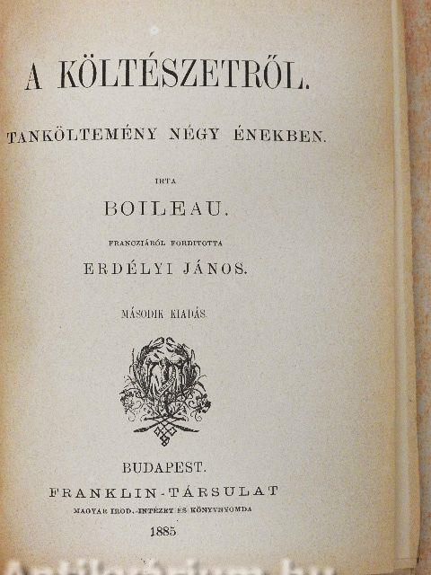 Boileaunak e nagyszerű tankölteményét nem most és tőlem veszi először a magyar olvasó; az még az Erdélyi Muzeum VII. füzetében jelent meg Döbrentei fordítása szerint prózában, némi kihagyásokkal, s néhol szaporítva is. E munka Boileaunak fő-műve; a francziák úgy ítélnek, hogy ez alapítá meg ama nemességet és szilárdságot, mely első rangú íróikban tapasztalható. Becsét főkép három tekintet emeli: a vállalat nehézsége, a versek szép- és az egésznek hasznos volta. Közelismerés szerint e Poetica Horáczénál kimerítőbb, rend dolgában pedig amaz vele nem is hasonlítható. Boileau ellenségei azt hozzák ugyan föl ellene, hogy ez csak fordítása Horáczénak; azonban erre még ő megfelelt maga, szépen megköszönve a dicséretet, mondván: munkámba, mely ezer száz versből áll, mintegy ötven-hatvan vétetett Horáczból; engem nem érhet nagyobb dicséret azokénál, kik azt hiszik, hogy a többit e nagy költőből fordítanám, s meglepő rám nézve, miért vívnak mégis a szabályok ellen, melyek benne előadatnak. Vissza
