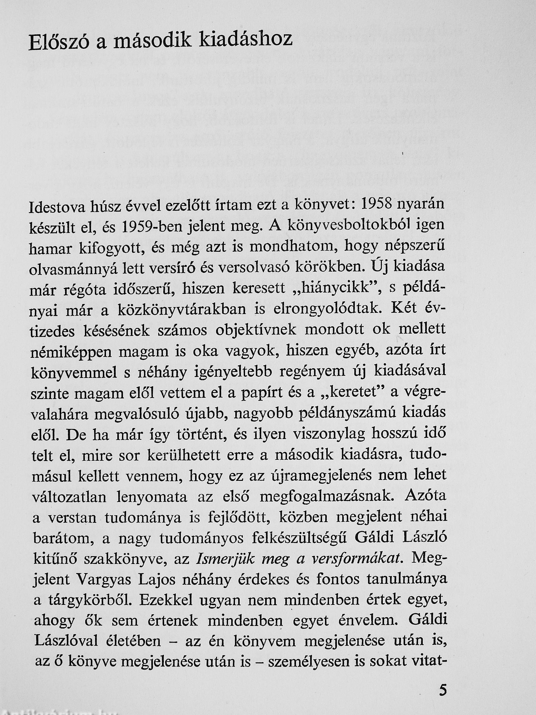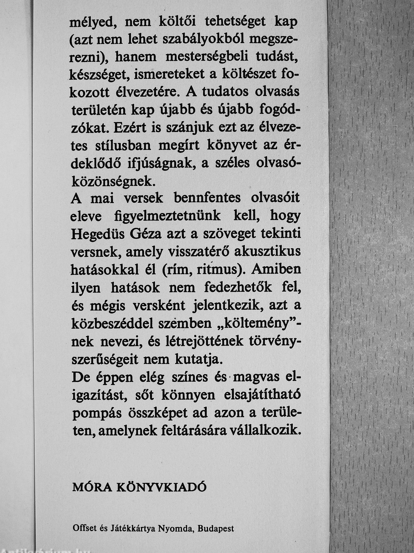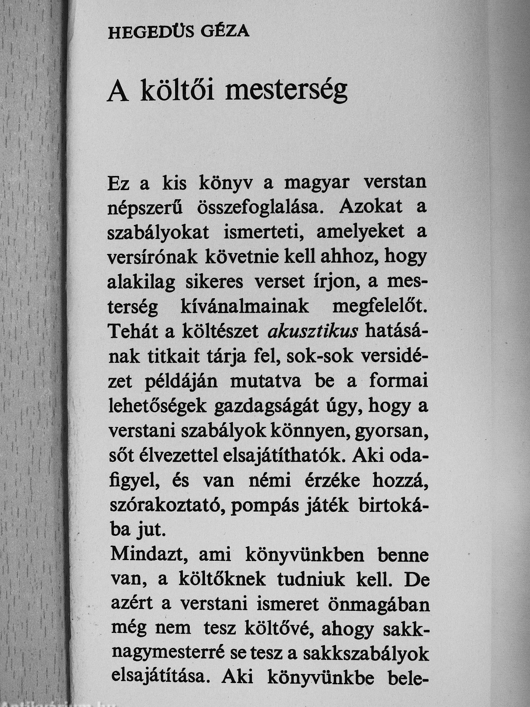 mélyed, nem költői tehetséget kap (azt nem lehet szabályokból megszerezni), hanem mesterségbeli tudást, készséget, ismereteket a költészet fokozott élvezetére. A tudatos olvasás területén kap újabb és újabb fogódzókat. Ezért is szánjuk ezt az élvezetes stílusban megírt könyvet az érdeklődő ifjúságnak, a széles olvasóközönségnek.