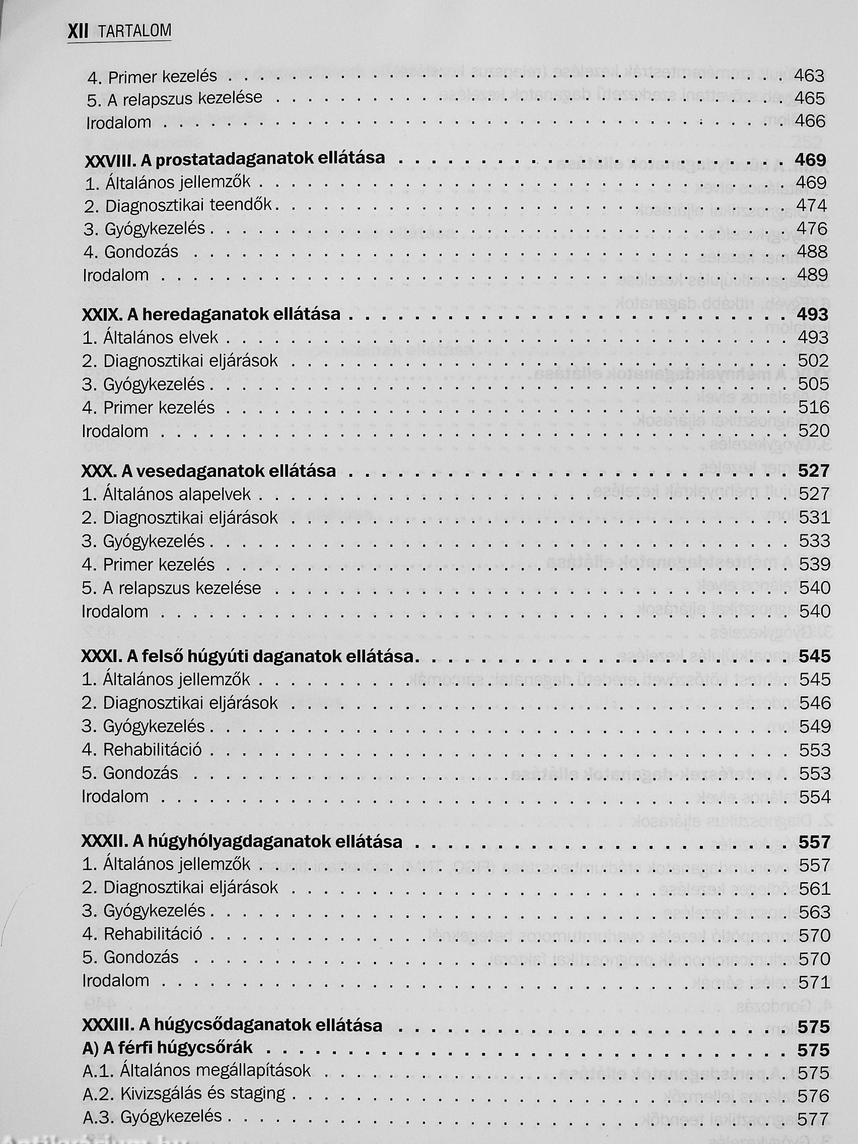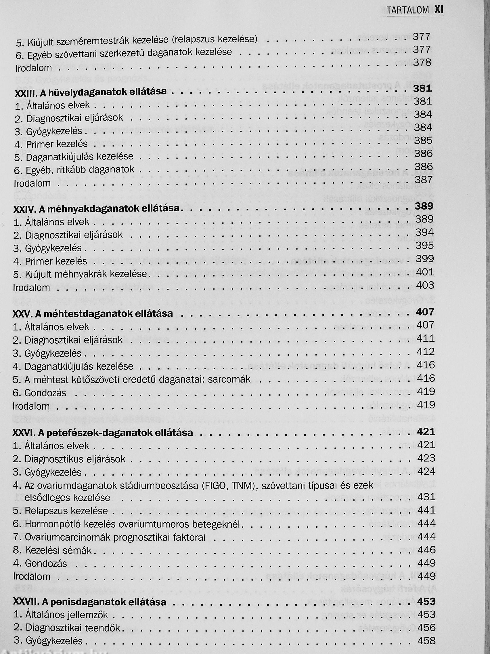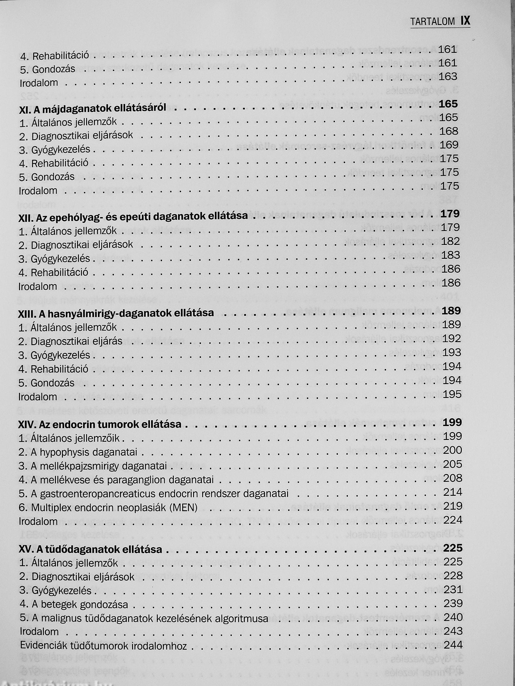 Főbb fejezetei: fej-nyaki tumorok, az emésztőtraktus tumorai, endokrin daganatok, a tüdő daganatai, csont- és lágyrésztumorok, bőrtumorok, emlőrák, női és férfi nemi szervek daganatai, húgyrendszeri tumorok, idegrendszeri daganatok, a szem daganatai, malignus lymphomák, rejtett tumorok, PET-G: