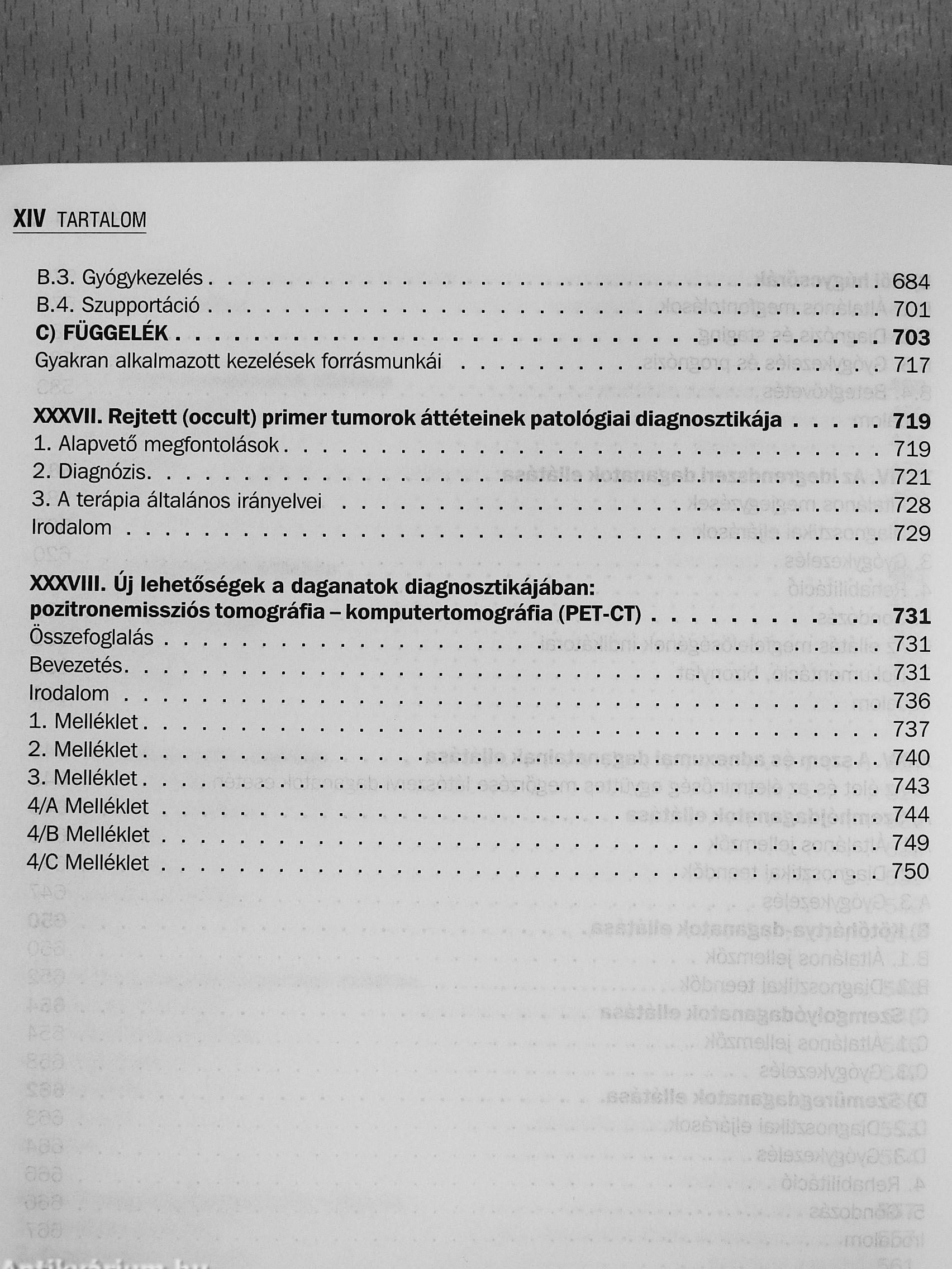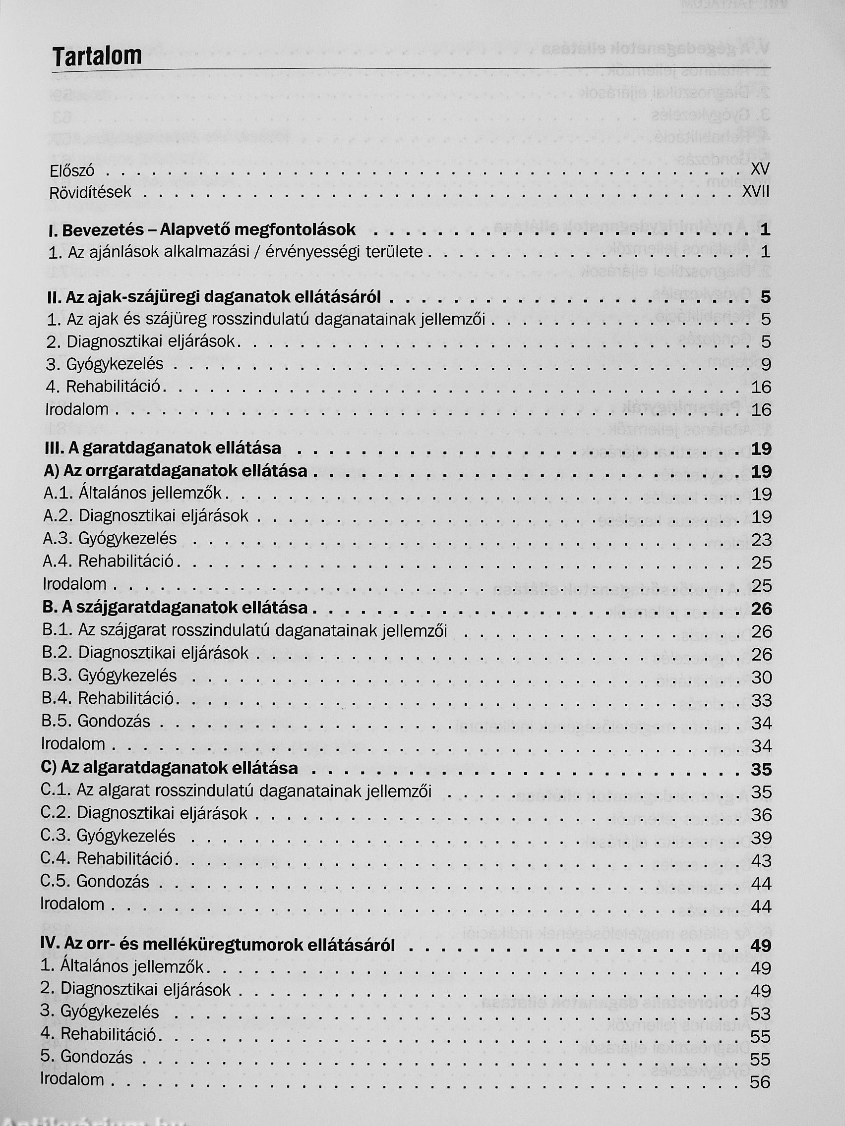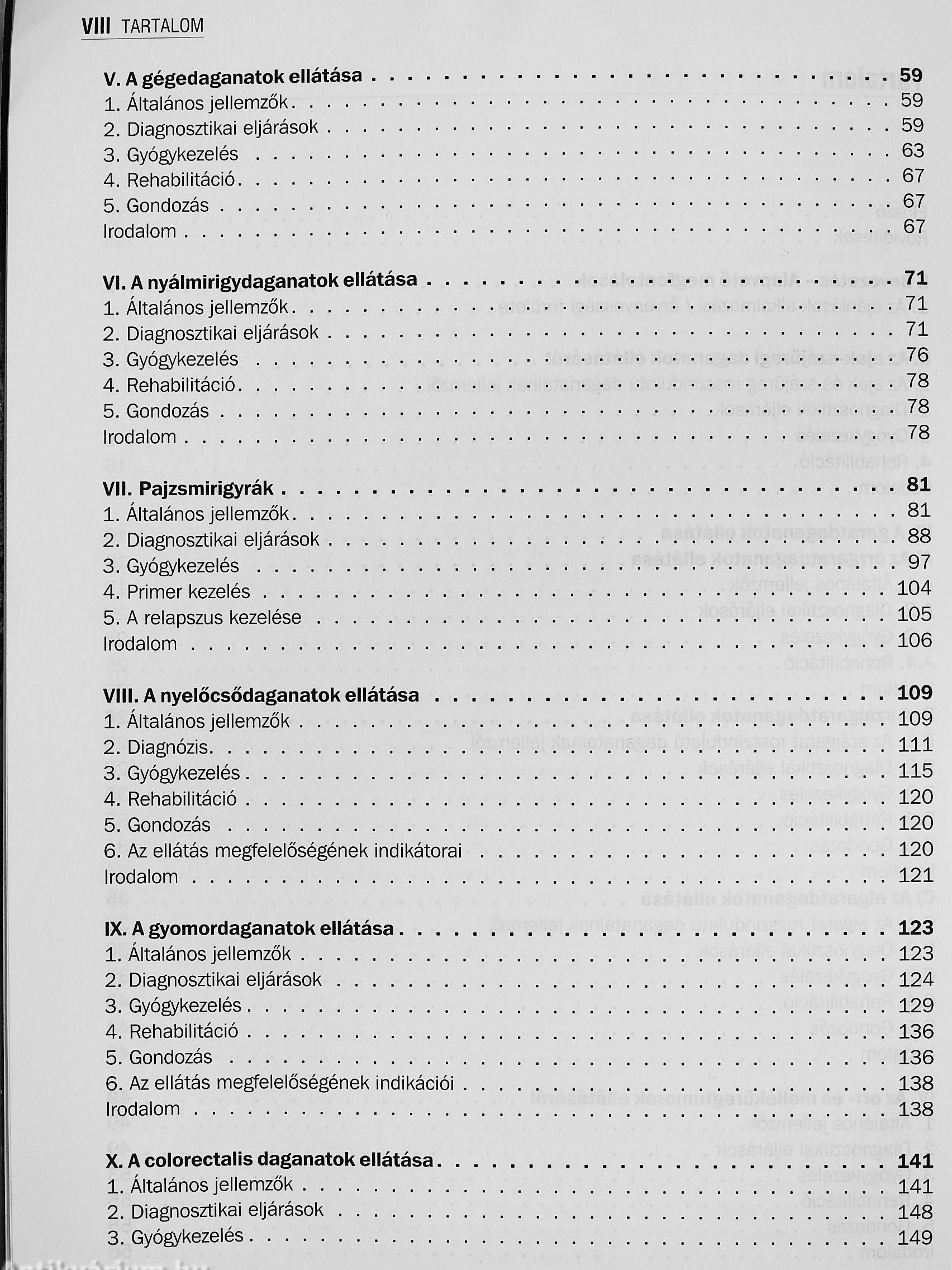 Főbb fejezetei: fej-nyaki tumorok, az emésztőtraktus tumorai, endokrin daganatok, a tüdő daganatai, csont- és lágyrésztumorok, bőrtumorok, emlőrák, női és férfi nemi szervek daganatai, húgyrendszeri tumorok, idegrendszeri daganatok, a szem daganatai, malignus lymphomák, rejtett tumorok, PET-G: