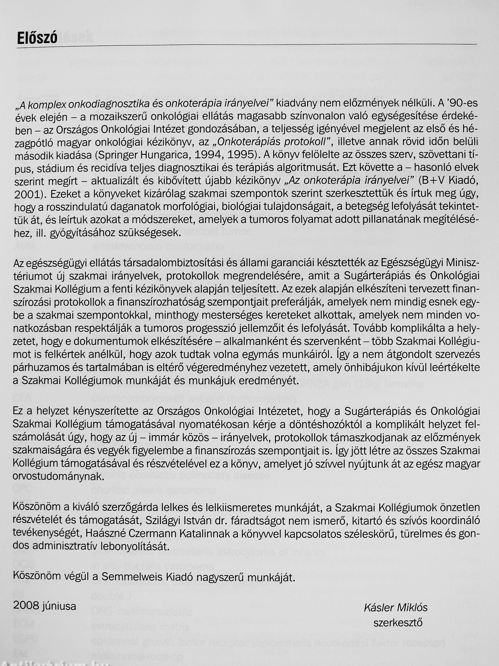 E könyvet és előzményeit (Onkoterápiás protokoll, Springer Hungarica, 1994,1995; Az onko-terápia irányelvei, B-f-V Kiadó, 2001) kizárólag szakmai szempontok szerint szerkesztettük és írtuk meg úgy, hogy a rosszindulatú daganatok morfológiai, biológiai tulajdonságait, a betegség lefolyását tekintettük át, és összefoglaltuk azokat a módszereket, amelyek a tumoros folyamat adott pillanatának megítéléséhez, illetve gyógyításához szükségesek. Az új kiadás aktualizálása a társszakmák Szakmai Kollégiumainak részvételével és támogatásával történt, amely jó példája annak a multidiszciplináris csapatmunkának, amely az onkológiai betegek ellátásának elengedhetetlen része.