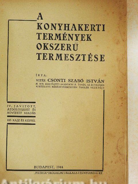 | Megjegyzés: | Negyedik javitott, átdolgozott és bővített kiadás. Írta Vitéz Csonti Szabó István m. kir. kertészeti akadémiai r. tanár, az általános kertészeti növénytermesztési tanszék vezetője. 183 fekete-fehér képpel illusztrálva. Nyomtatta a "Pátria" Rt. |