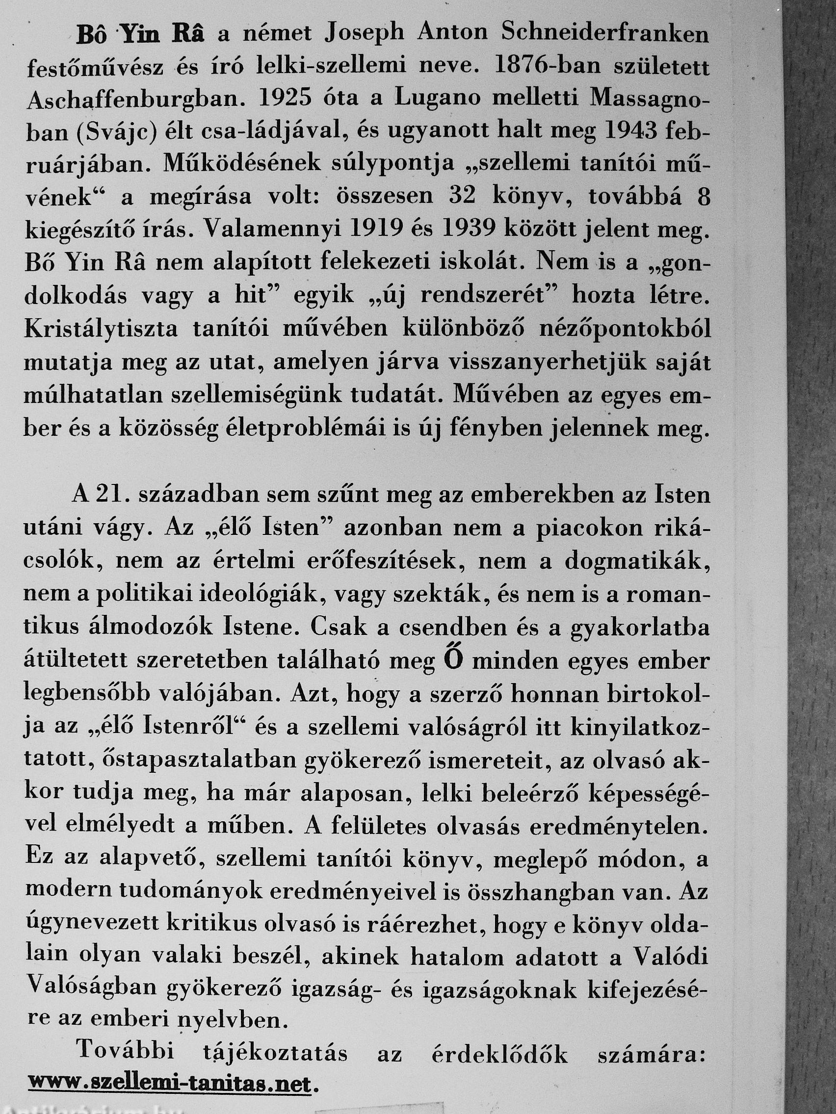 Bó Yin Rá a német Joseph Anton Schneiderfranken festőművész és író lelki-szellemi neve. 1876-ban született Aschaffenburgban. 1925 óta a Lugano meUetti Massagno-ban (Svájc) élt csa-ládjával, és ugyanott halt meg 1943 februárjában. Működésének súlypontja „szellemi tanítói művének" a megírása volt: összesen 32 könyv, továbbá 8 kiegészítő írás. Valamennyi 1919 és 1939 között jelent meg. Bő Yin Rá nem alapított felekezeti iskolát. Nem is a „gondolkodás vagy a hit" egyik „új rendszerét" hozta létre. Kristálytiszta tanítói művében különböző nézőpontokból mutatja meg az utat, amelyen járva visszanyerhetjük saját múlhatatlan szellemiségünk tudatát. Művében az egyes ember és a közösség életproblémái is új fényben jelennek meg.